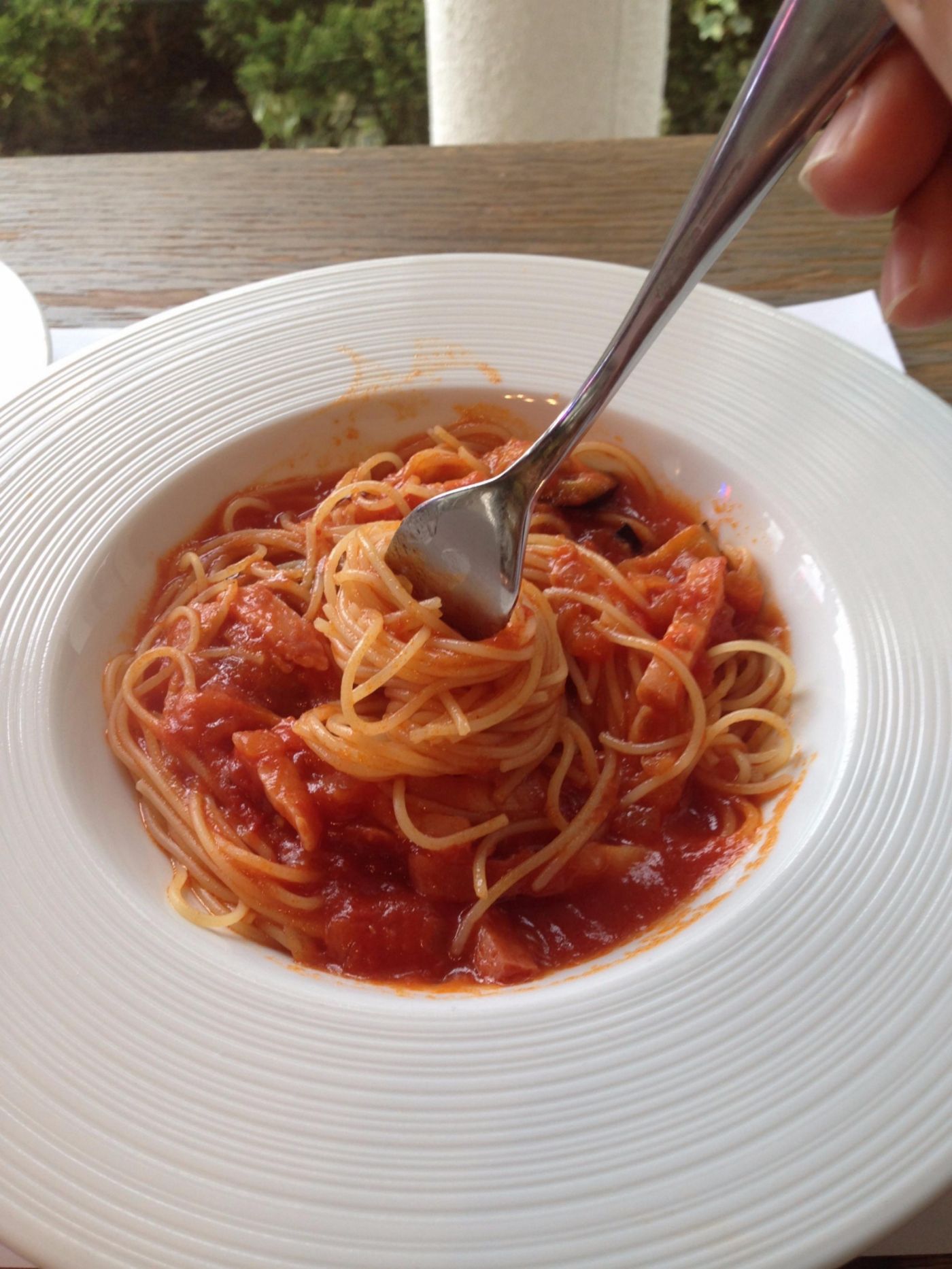 ต่อด้วยสปาเกตตี้ ความเปรี้ยวนิด ๆ ของมะเขือเทศตัดกับรสเค็มนิด ๆ ของแฮมรสชาติดีถือว่าดีทีเดียวครับ ถ้าไม่อายคนในร้านอยากจะยกจานขึ้นมาเลียซอสมะเขือเทศที่เลอะขอบจานเลย
