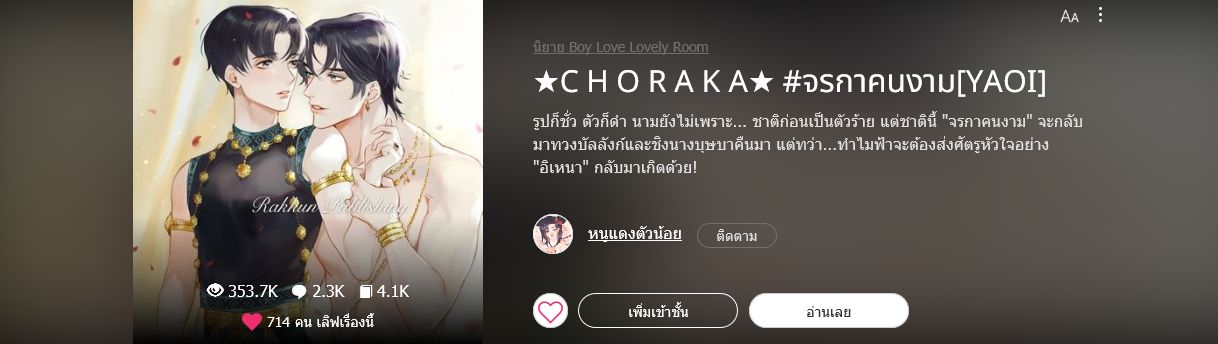 แต่ถ้ายังรู้สึกว่า ‘พี่คะ สองเรื่องข้างบนยังไม่ใช่แนวหนูจริงๆอะค่ะ’ ทางเราก็ขอแนะนำเป็นเรื่องนี้เลยค่ะ กับ c h o r a k a #จรกาคนงาม ที่อิงเนื้อเรื่องมาจาก วรรณคดีเรื่องอิเหนาที่เราคุ้นหูคุ้นตากันเป็นอย่างดี โดยเป็นเรื่องของ จิระ และ อินทรา ศัตรูคู่อาฆาตจากเรื่องอิเหนาในอดีตชาติ อย่างอิเหนาและจรกา ที่ชาติก่อนฆ่าฟันกันจะเป็นจะตาย แต่เหตุใดชาตินี้ถึงได้เกิดมาคู่กันซะงั้น และใครที่เดินสาย comedy บอกได้เลยว่าต้องห้ามพลาด และ คำเตือนคือไม่ควรอ่านในที่สาธารณะเด็ดขาด เพราะถ้าคุณไม่ใช่สายแข็งจริงๆ อาจจะมีกรามค้างกันอย่างแน่นอน