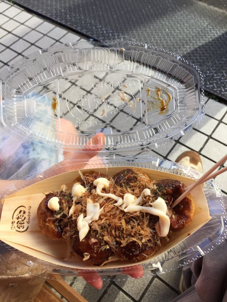 แวะพักกินทาโกยากิตรงหน้าซุปเปอรมาเก็ต นั้งกินตรงป้ายรถเมล์