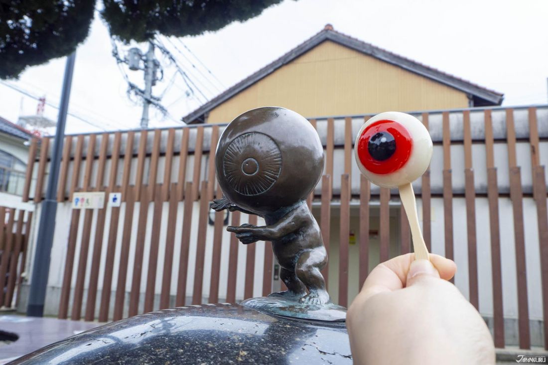 สำหรับของฝาก เราขอแนะนำ Yoka Medama-Oyaji ซึ่งอาจต้องใช้ความกล้าเป็นพิเศษในการรับประทานมันจูชิ้นแรก เนื่องจากขนมเหล่านี้มีรูปร่างเหมือนกับ เมดามะโอยาจิ พ่อของคิทาโร่ ซึ่งเป็นลูกตาที่น่ากลัวเล็กน้อย! แต่จริงๆแล้วขนมเหล่านี้ทำโดยร้านขายวากาชิ (ขนมญี่ปุ่น) ที่ค่อนข้างมีชื่อเสียงในซันอิน จึงมีรสชาติหวานเหมาะกับการรับประทานคู่กับชาเขียว