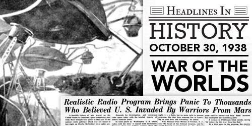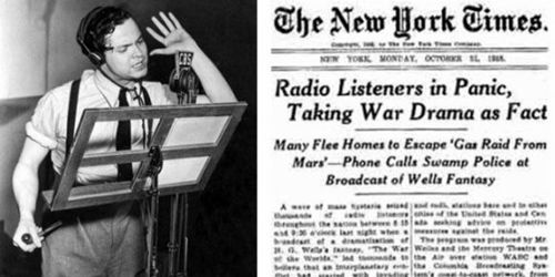 ออร์สัน เวลส์ (Orson Welles) เกี่ยวกับโลกที่ถูกรุกรานจากมนุษย์ต่างดาว ออกอากาศทางสถานีวิทยุ