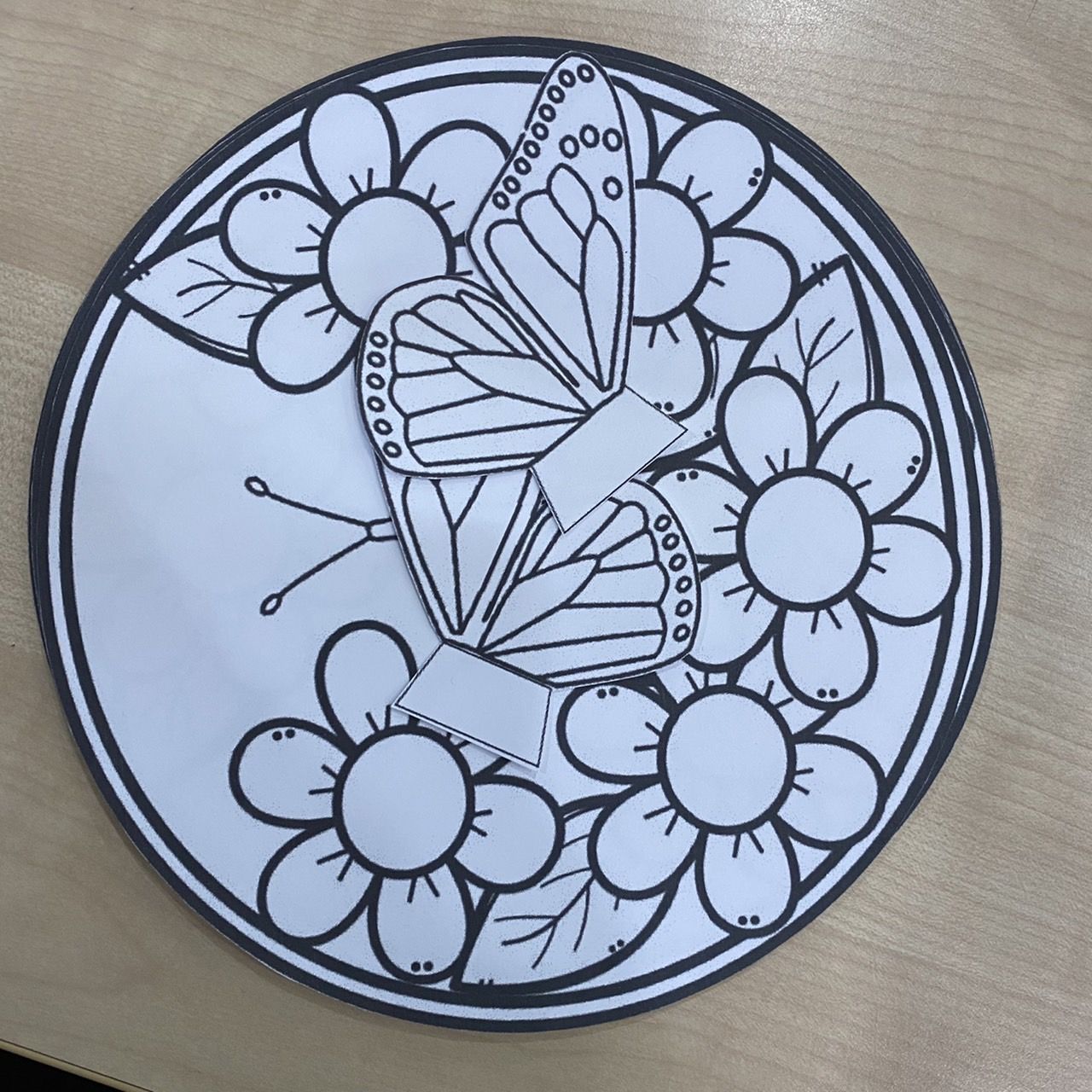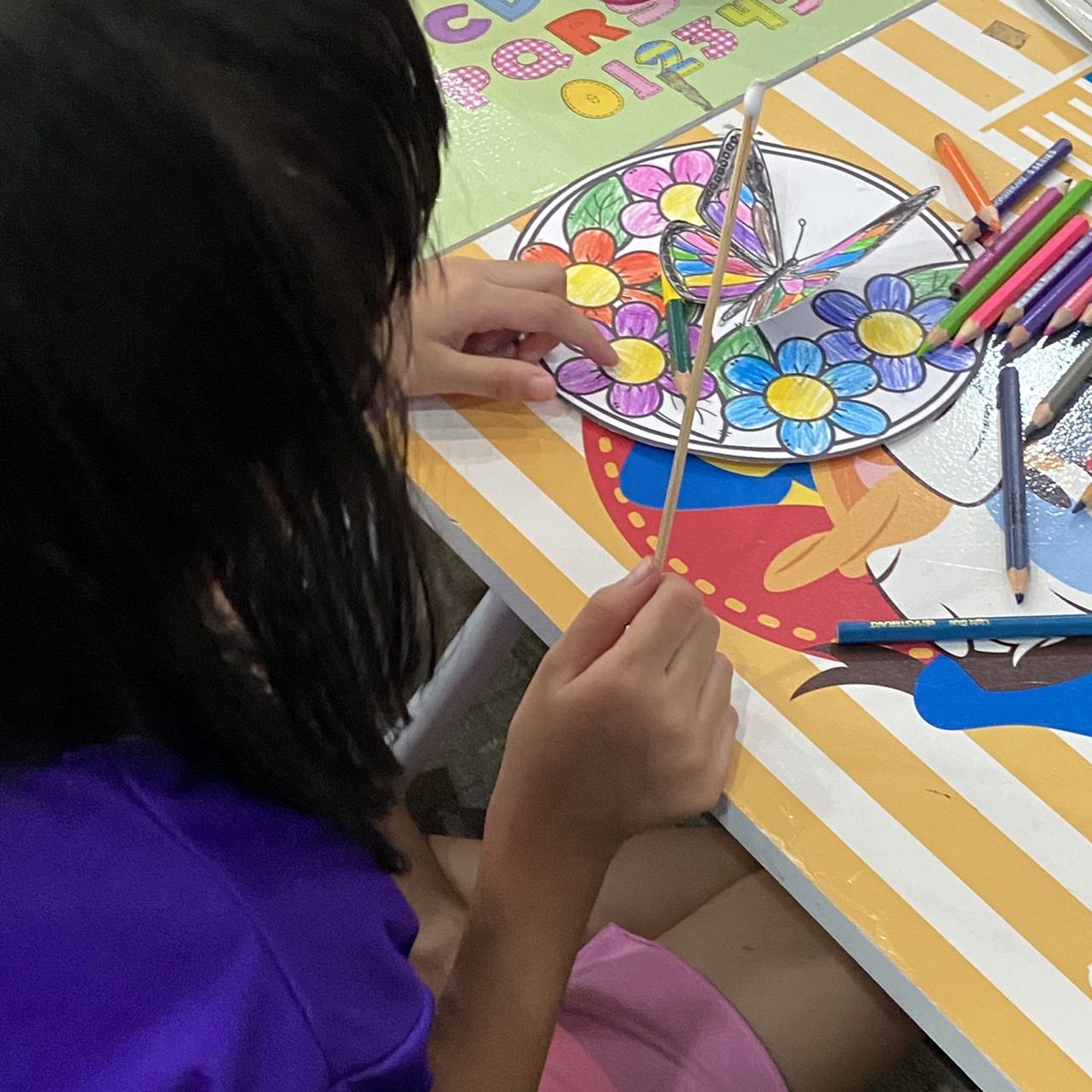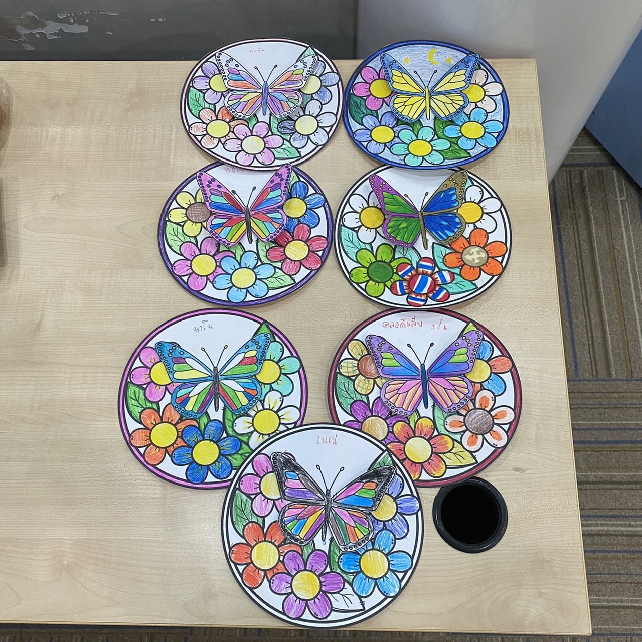 วันแรกของการฝึกงานเริ่มที่วันเสาร์ที่ 29 มิถุนายน 2566 วันแรกที่ไปตื่นเต้นมาก ๆ ค่ะ กลัวรถติด กลัวไปไม่ทันเพราะห้องสมุดเปิด 8 โมงครึ่งซึ่งวันนี้ไปถึงก่อนเวลาเกือบชั่วโมงเลยค่ะ เนื่องด้วยเป็นวันเสาร์รถจึงไม่ค่อยติด วิ่งสบายหายห่วง พอไปถึงก็รู้สึกเกร็งนิดหน่อยและมีความรู้สึกว่าเราจะทำมันได้ออกมาดีไหมนะ มีคำถามอยู่ในหัวเต็มไปหมด แต่ก็ต้องท่องไว้ว่าเราทำได้ เราทำได้ การฝึกงานครั้งนี้มีผู้ร่วมขบวนการด้วยอีก 2 คนค่ะ มีเหมย แพน และถ้ารวมเราด้วยก็จะเป็น 3 คน ถึงแม้เราจะทำได้บ้างไม่ได้บ้างอย่างน้อยก็ยังมีเพื่อนคอยช่วยพยุงค่ะ แค่มีเพื่อนก็อุ่นใจในระดับหนึ่ง กิจกรรมแรกของวันนี้คือระบายสีค่ะ ระบายสีผีเสื้อแล้วนำมาประกอบเข้ากับดอกไม้หรือถ้าใครไม่ชอบก็จะมีให้ระบายสีตัวการ์ตูนต่าง ๆ