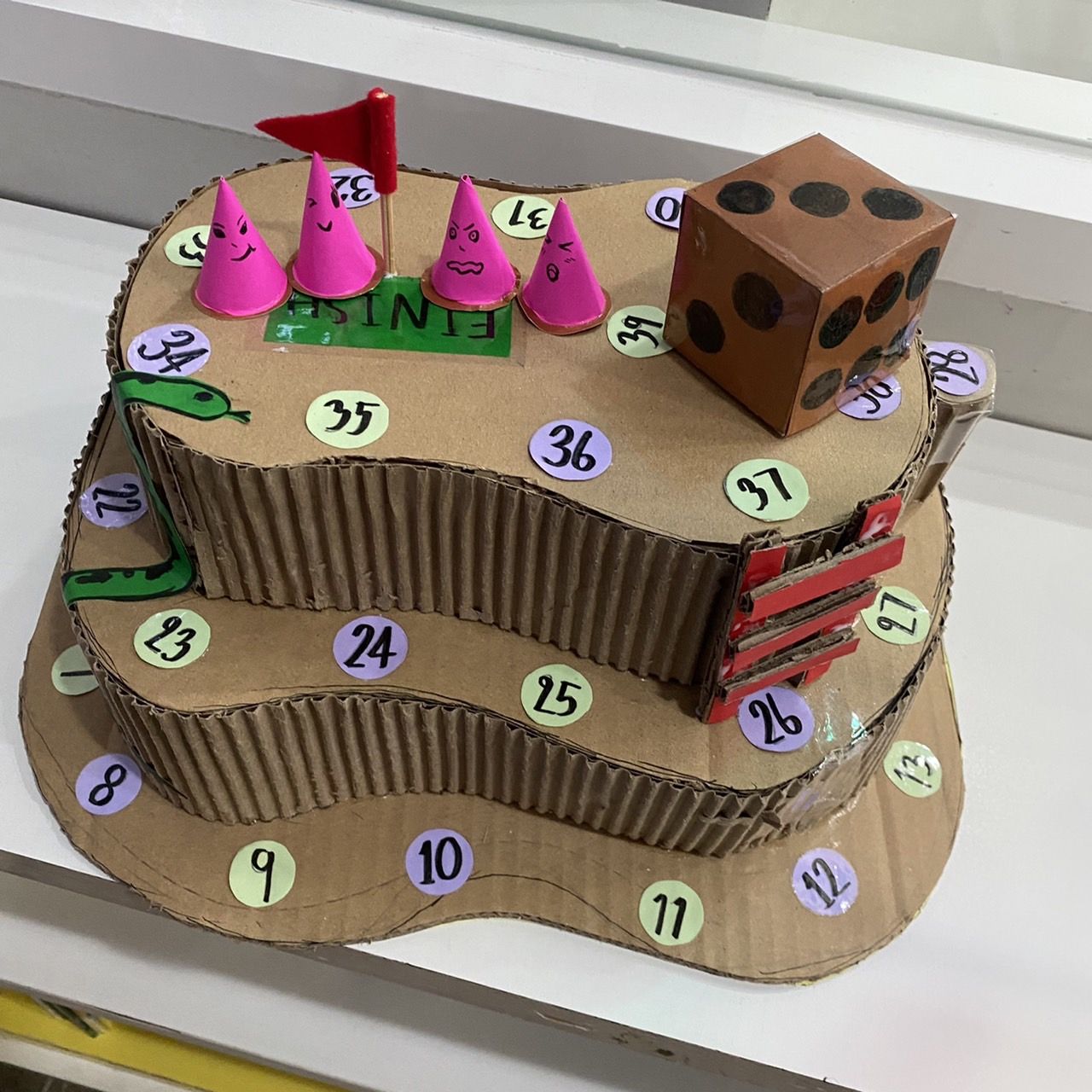ต่อมาคือวันที่สาม วันนี้เราสามคนช่วยกันทำบันไดงูให้เด็ก ๆ เล่นค่ะ ทำจากกระดาษลังซึ่งมันดูเหมือนทำง่ายนะคะ แต่กินเวลาไปเกือบวันเลยค่ะ