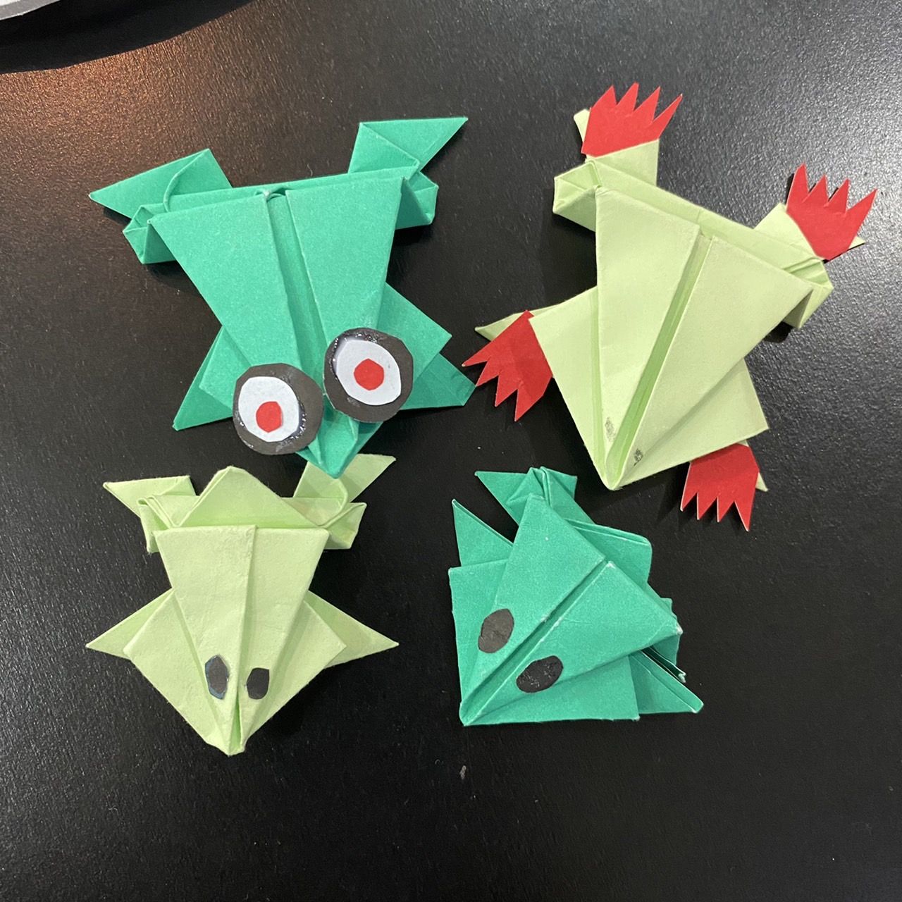 แรก ๆ พี่ ๆ ก็งงกับการพับแต่ก็สามารถพับออกมาได้ด้วยดีจึงไปชวนน้อง ๆ มาพับด้วยซึ่งน้อง ๆ ที่มาพับจะมีเด็กอนุบาลและเด็กประถมปลายค่ะ ไม่รู้ว่าการพับกบมันยากเกินไปไหมเพราะน้อง ๆ เปลี่ยนจากการพับกบมาเป็นการฉีกกระดาษและแต่งเติมกันเอาเองค่ะซึ่งน้อง ๆ แต่ละคนก็ได้ออกแบบการฉีกหรือตัดกระดาษด้วยตัวเองมันก็ออกมาน่ารักดีค่ะ