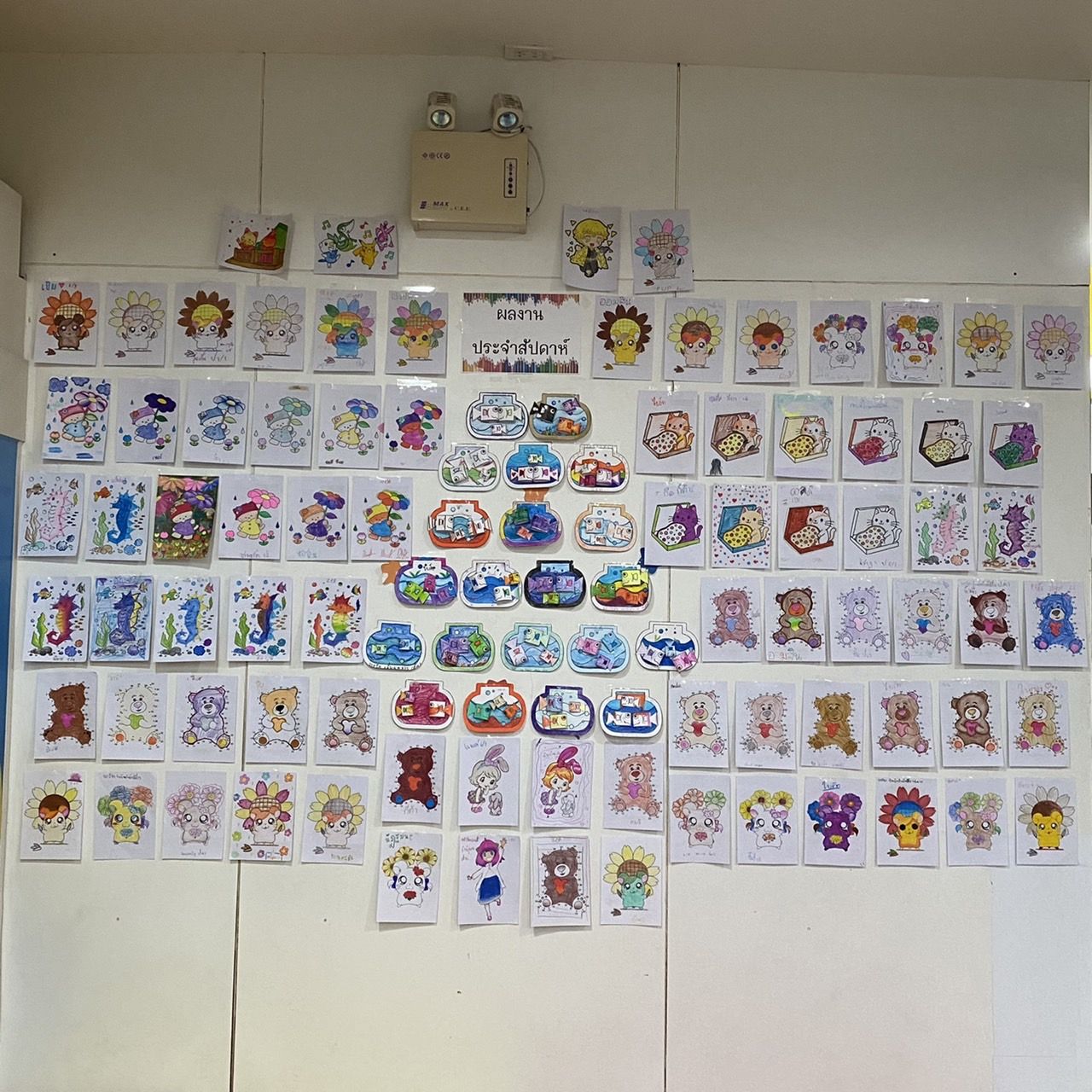 หลังจากที่ระบายเสร็จแล้วจะนำผลงานของน้อง ๆ มาติดรวมกันแบบนี้ มองดูแล้วสวยงามสุด ๆ ไปเลยใช่ไหมคะ น้อง ๆ สามารถเลือกติดได้เองตามใจชอบ ส่วนมากที่ที่น้อง ๆ จับจองกันจะเป็นด้านบนซะส่วนใหญ่ค่ะพากันติดด้านบนกันเต็มไปหมดเลย