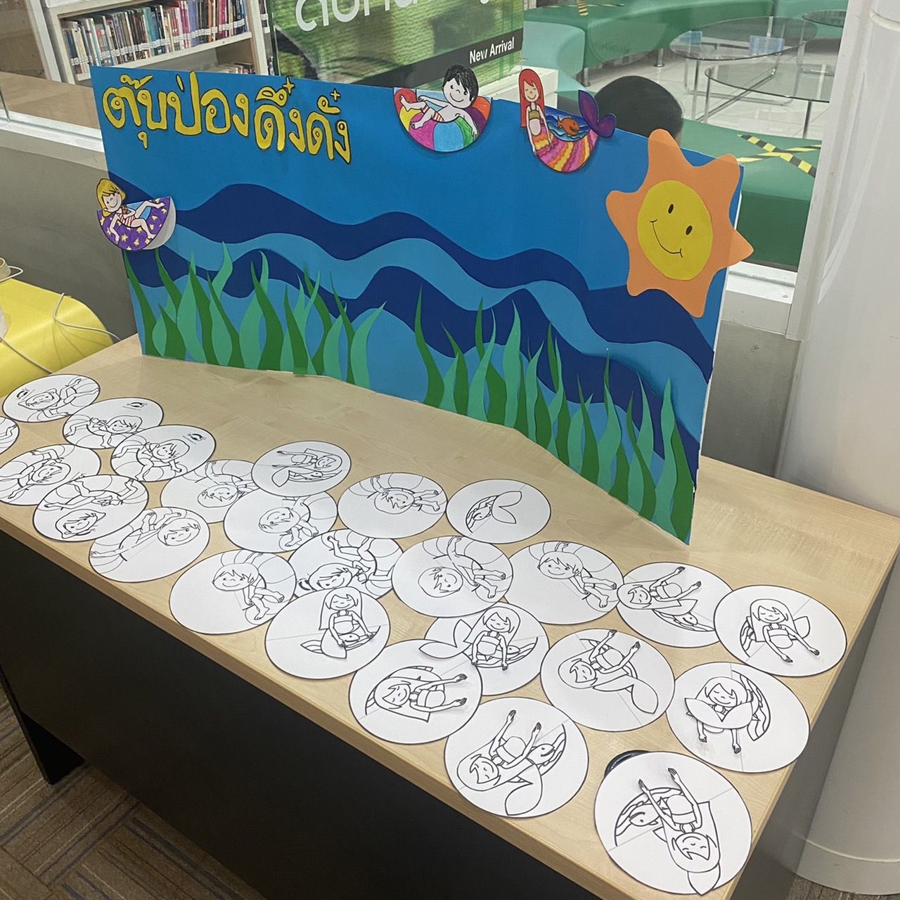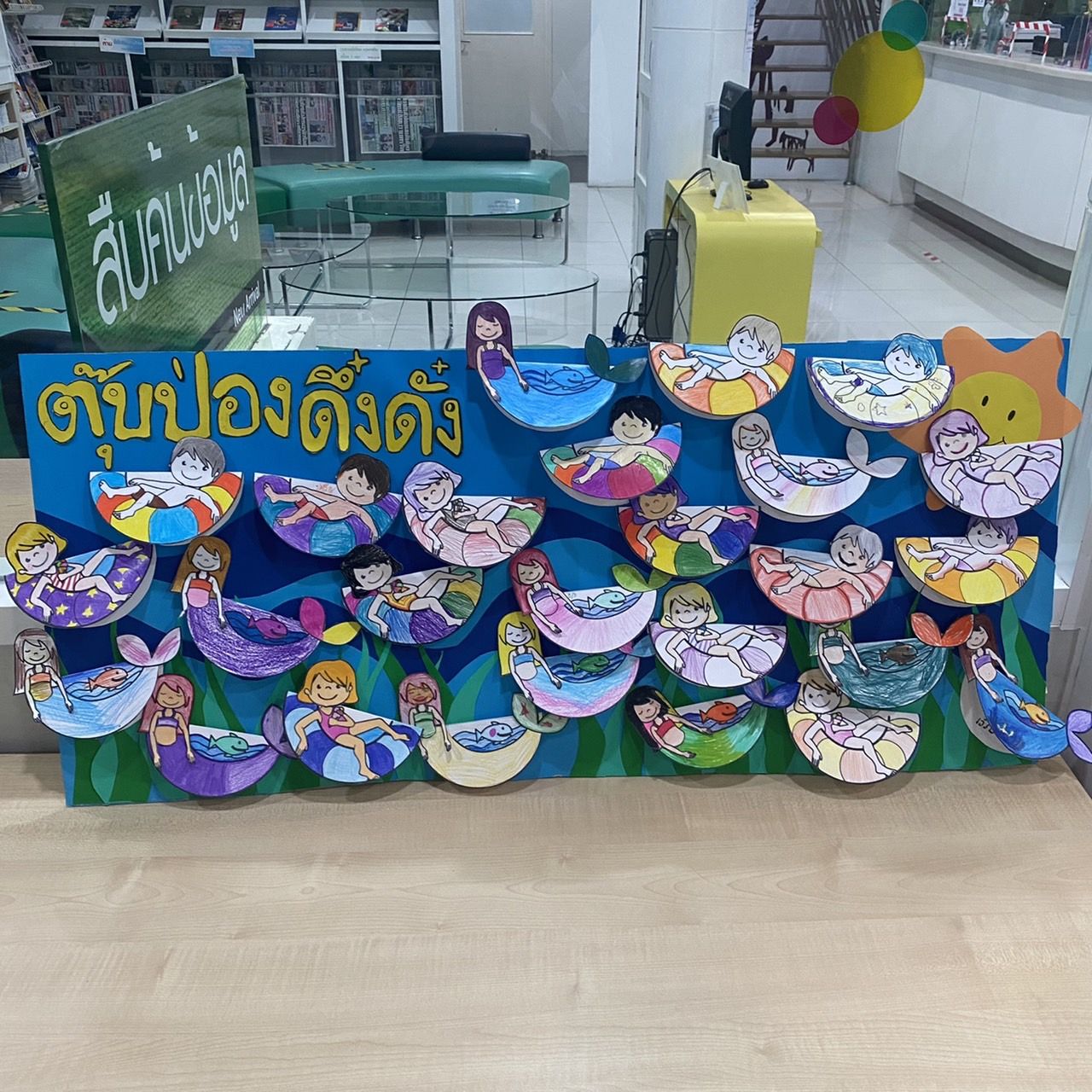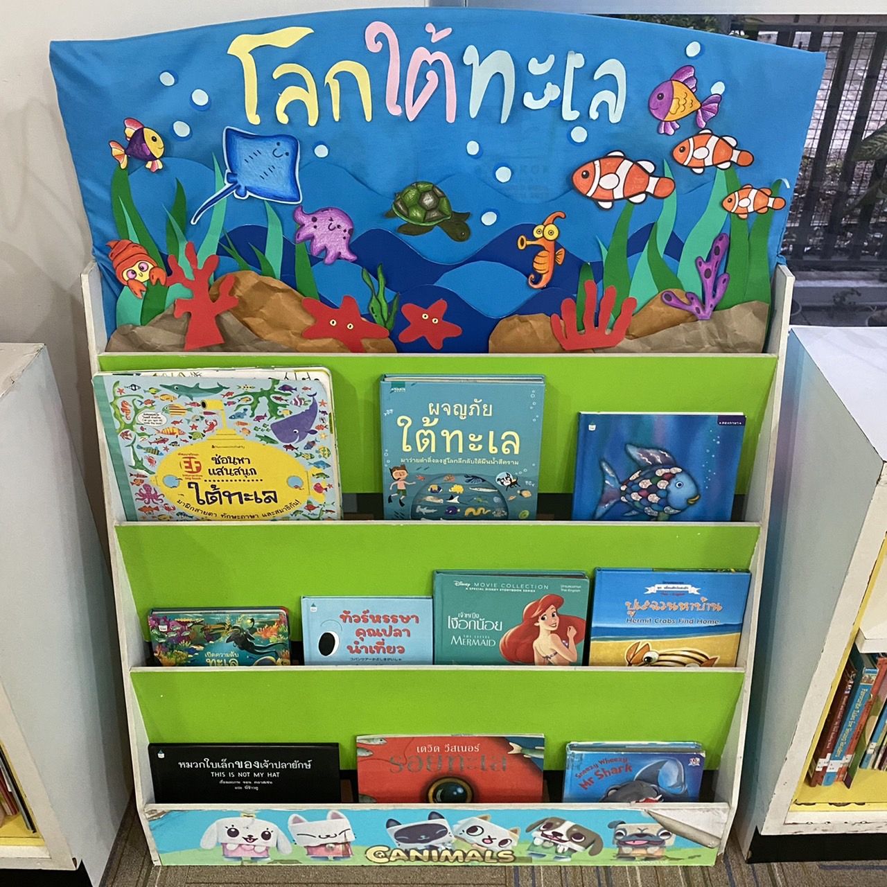 วันถัดมาเราจัดชั้นหนังสือให้น้องค่ะทำเป็นธีมเกี่ยวกับโลกใต้ทะเล ชั้นนี้จะเปลี่ยนเดือนละครั้งซึ่งในแต่ละครั้งเราจะคิดกันเองว่าจะเป็นธีมอะไร และหนังสือในชั้นก็ต้องสอดคล้องกับที่เราทำด้วยซึ่งก็สนุกดีค่ะ สนุกตรงหาหนังสือมาวางในชั้นให้มันเป็นธีมเดียวกัน และก็รู้สึกดีใจค่ะเมื่อทำเสร็จแล้วมีน้อง ๆ เดินเข้ามาให้ความสนใจกับชั้นหนังสือที่เราทำ แต่จากที่ดู ๆ มาน้อง ๆ ไม่ค่อยอ่านหนังสือกันสักเท่าไหร่ชอบหยิบหนังสือไปเล่นกันมากกว่าค่ะ