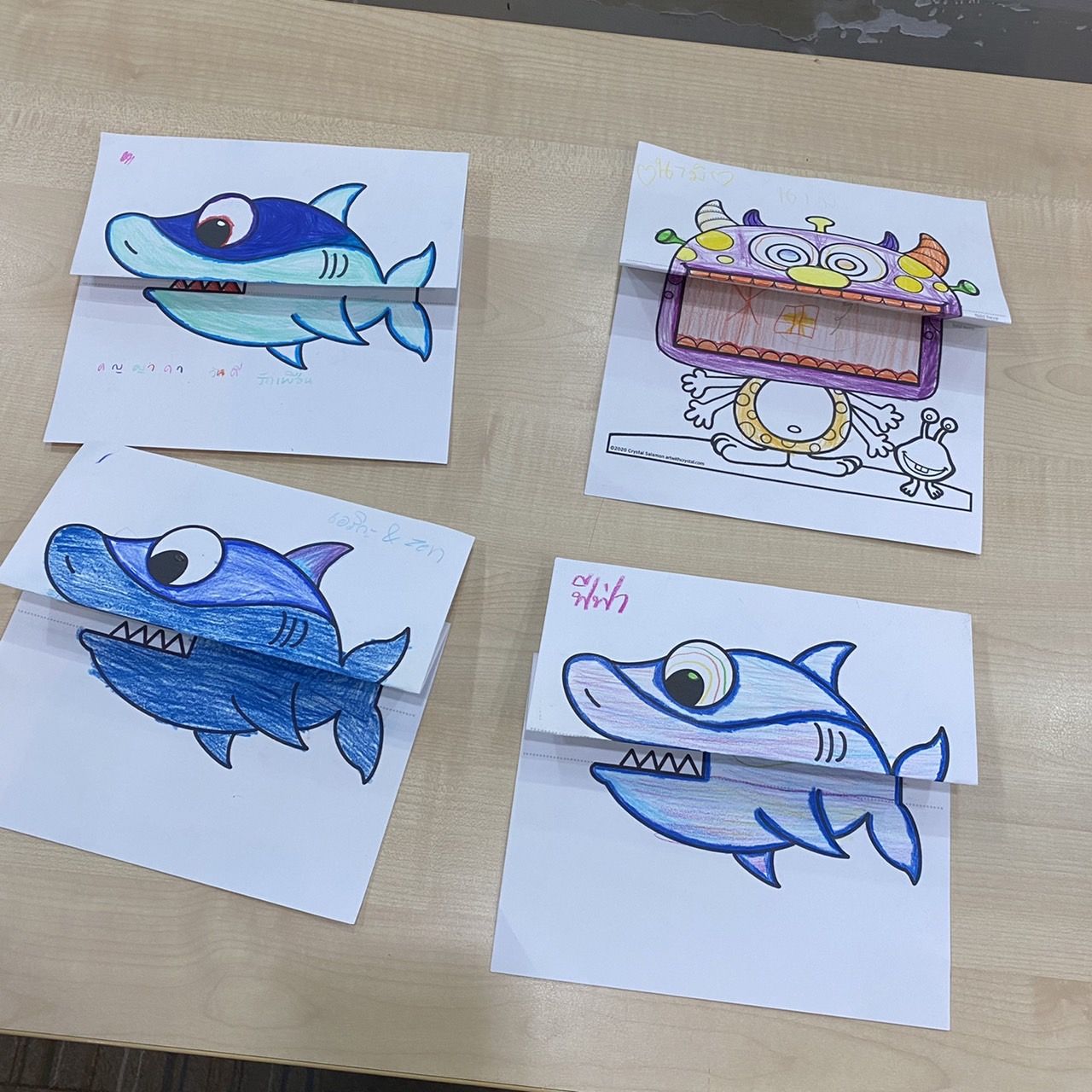 วันนี้กิจกรรมของน้อง ๆ ก็คือการระบายสีปลาฉลามและสัตว์ประหลาดค่ะ เมื่อระบายเสร็จแล้วจึงนำมาพับว่าแต่ละตัวน้อง ๆ ว่าอะไรเพิ่มเติมลงไปในท้องของปลาฉลาม น้อง ๆ ชอบระบายสีรูปภาพที่ไม่ค่อยซับซ้อนค่ะ จากการสังเกตของเราเองน้อง ๆ จะชอบอะไรที่ไม่เหมือนเราชอบ เช่น เราเข้าไปหากิจกรรมให้ทำพอเห็นว่ามันน่าทำ น่ารัก น้อง ๆ ต้องชอบแน่แต่กลับกลายเป็นว่าถ้ามีรูป 2 รูปที่แตกต่างกัน อันหนึ่งดูเรียบง่ายและในความคิดเราคือมันไม่น่าทำเลยแต่น้อง ๆ มักจะชอบมาก ในทางกลับกันถ้าอีกอันเราชอบมาก ๆ น้อง ๆ ต้องถูกใจแน่ปรากฏว่าน้อยคนที่จะเลือก บางครั้งก็ทำให้รู้สึกว่าเราก็ยังเลือกงานที่ไม่ค่อยเหมาะสมให้กับน้องเท่าไหร่ แต่ว่าจะพยายามให้มากขึ้นค่ะ
