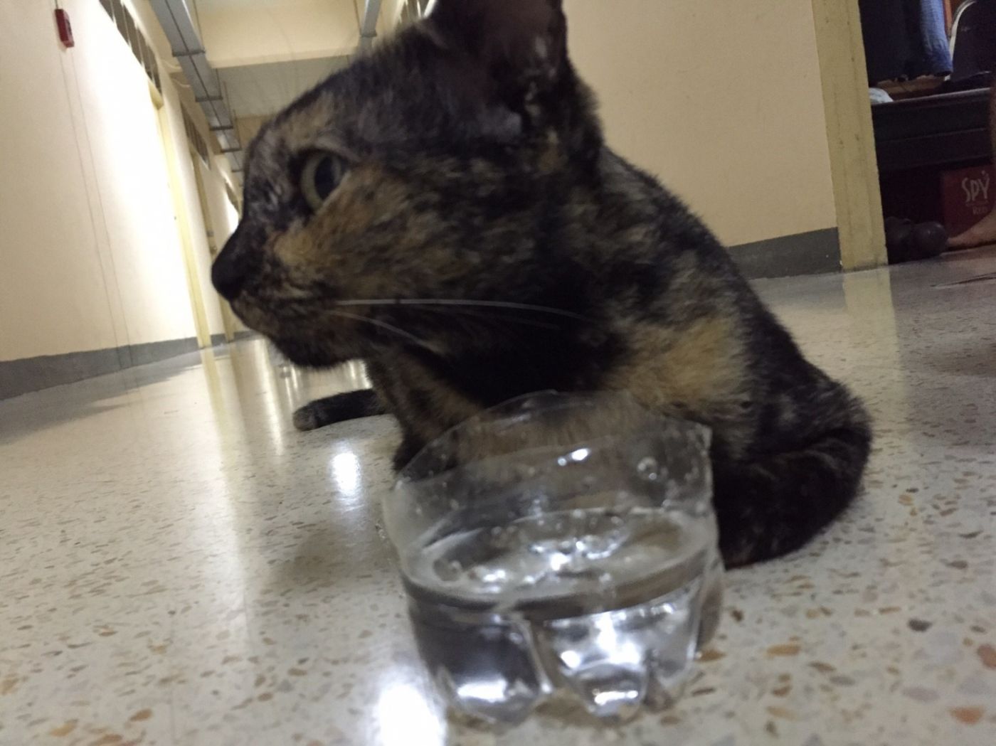 มีอยู่วันหนึ่ง เธอเดินมาหน้าห้องผมตามปกติ แต่วันนี้ผมนึกคึกอยากจะลองให้อะไรเธอกินหน่อย ผมตัดขวดน้ำให้เป็นเหมือนถ้วยแล้วเทน้ำให้เธอกิน เธอเห็นแล้วรีบตั้งหน้าตั้งตาซดแบบไม่เกรงใจ ซดแหลกเหมือนกับกินบุฟเฟต์ที่จับเวลาอยู่ยังไงอย่างงั้น