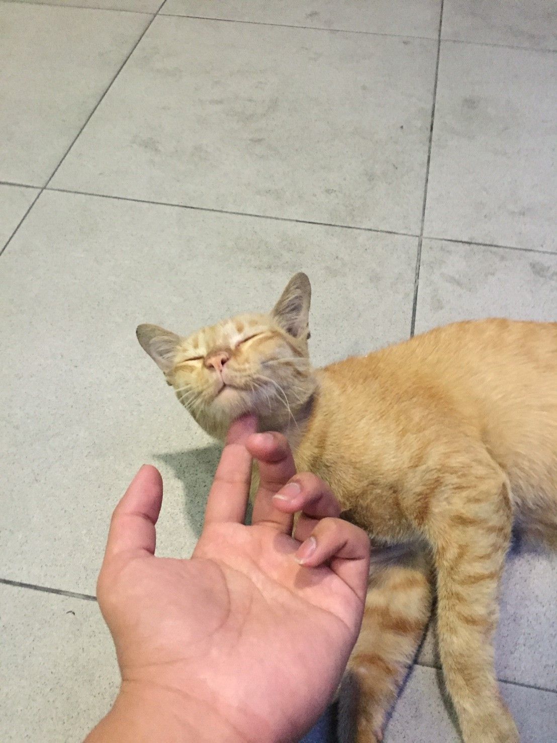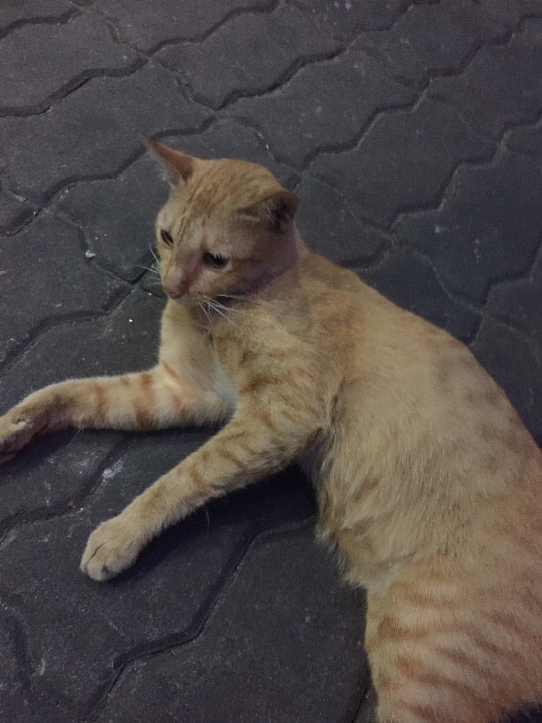 ป้าเล่าว่าป้าเจอแมวตัวนี้ได้สักพักแล้ว น่าจะมีคนเอามาปล่อยหรือไม่ก็หลงมาเพราะดูไม่กลัวคนไม่กลัวหมาไม่กลัวอะไรทั้งนั้น มันชอบจะอ้อนคนด้วยซ้ำ เห็นคนไปเล่นกับมันบ่อย ป้าเห็นมันประจำทุกเช้าเวลาป้ากวาดขยะบางทีป้าหมั่นเขี้ยวก็เอาไม้กวาดไปแหย่ๆมัน (อ้าวป้า เมื่อกี๊กูอุ้มซะเต็มมือ...)