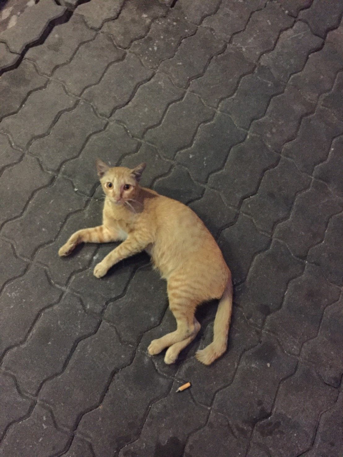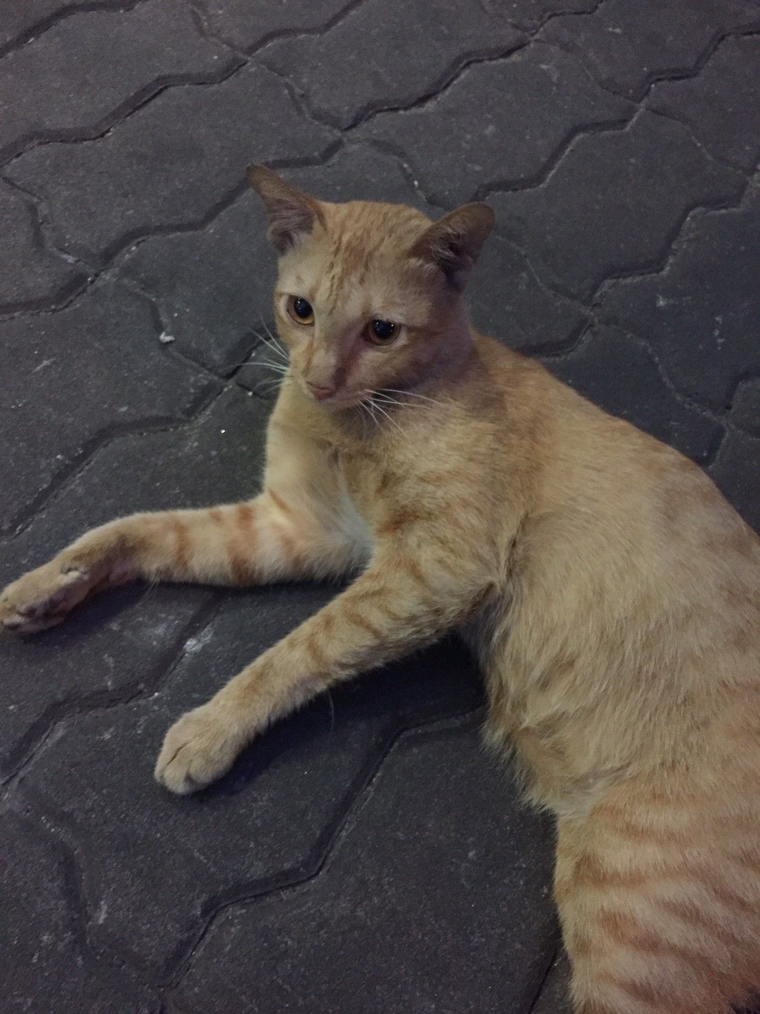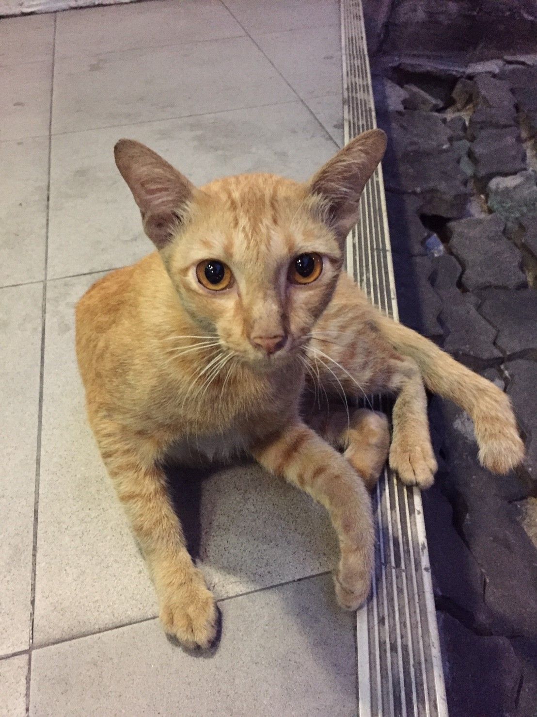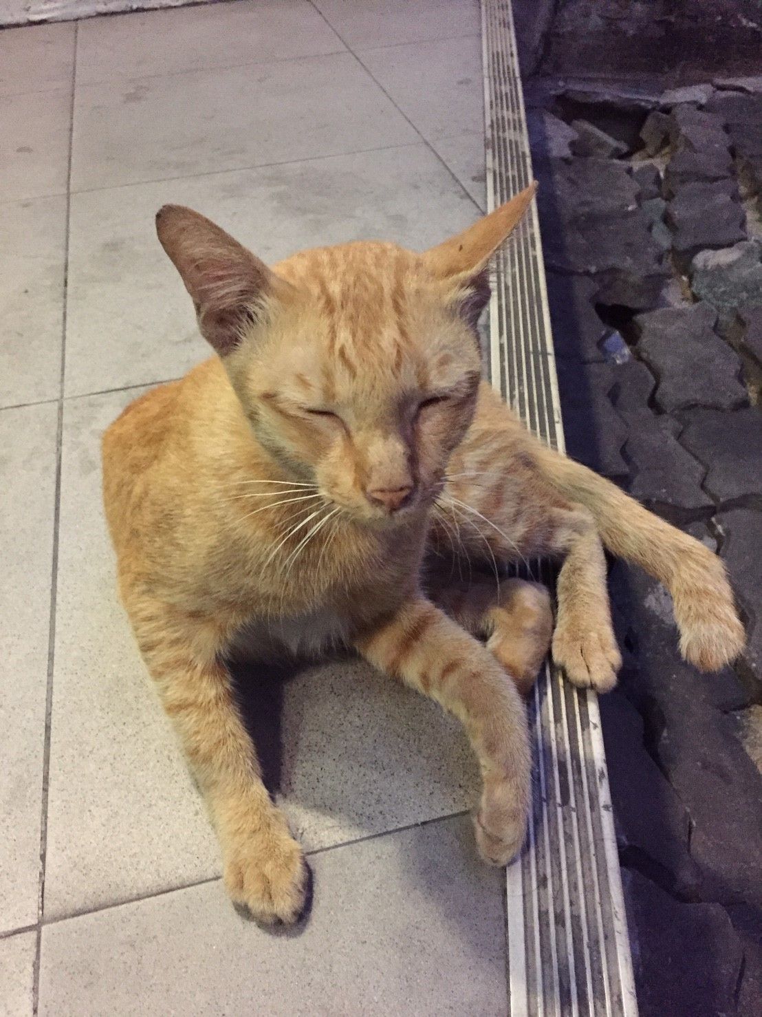 ผมนั่งกินขนมปังปิ้งกับนมกล่องที่ซื้อจากเซเว่นไปพร้อมๆ กับเล่นเจ้าแมวตัวนี้ ด้วยความที่เขาดูหิวโซ ร่างกายผอมบาง ผมจึงแบะขนมปังปิ้งออกเล็กน้อยแล้วโยนให้เขาทาน มันอาจจะทำให้ผมอิ่มน้อยลงแต่อย่างน้อยผมก็มีความสุขที่ได้แบ่งปันอะไรเล็กๆ น้อยๆ ให้กับสัตว์โลกที่น่ารัก มันทำให้รู้สึกดีก่อนที่จะได้เดินทางไกลนะ :)
