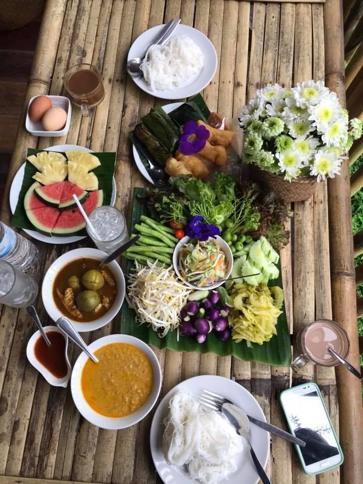 ยิ่งมื้อเช้าเป็นขนมจีน 3 น้ำยาได้แก่ น้ำยากะทิ, แกงไตปลา, น้ำจิ้มหวาน ทานคู่กับผักออร์แกนิกสดๆ อย่าได้พลาดเลยล่ะเพราะน้ำยากะทิอร่อยมาก รสชาติเข้มข้น เนื้อปลาแน่นๆ แถมยังเติมได้ไม่อั้นอิ่มไปยันมื้อเที่ยงอ่ะบอกเลย
