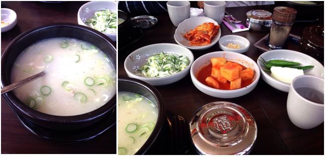 มีวันนึงต้องออกจากโรงแรมแต่เช้า คนเกาหลีอีกคนมารับและพาไปกินข้าวเช้า เป็นร้านเล็กๆทั้งร้านมีเมนูนี้เมนูเดียว ตอนเขาเอาเสิร์ฟคืออาหารน่าตาน่ากินมาก คิดในใจต้้องอร่อยมากแน่ๆ คาดหวังสูงมาก พอซดน้ำเข้าไปคำแรก ความหวังแหลกสลายยย จืดเหลือเกินนนนนน เป็นซุปเนื้อวัว วิธีกินคือเอาข้าวสวยเทใส่ในซุปสีขาวๆ ในใจตอนนั้นคือคิดถึงน้ำพริกน้ำปลาอย่างสุดหัวใจ ยังดีที่มีกิมจิผักกาดกับกินจิหัวไชเท้าช่วยให้มีรสชาติขึ้นมาอีกหน่อย