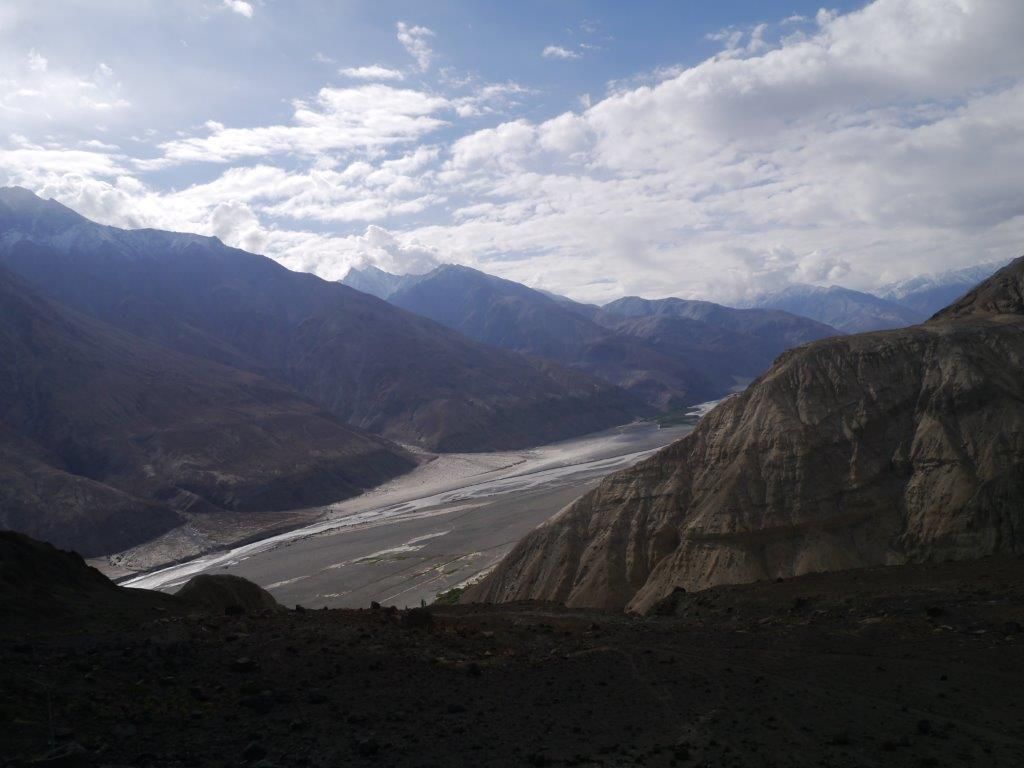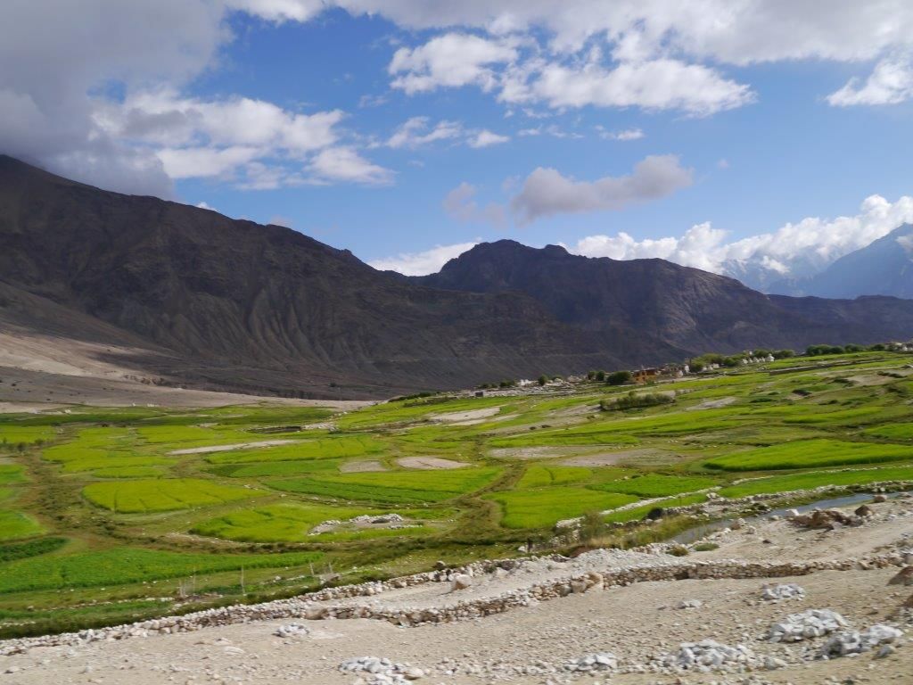 จากนั้นโซนัมพาพวกเราไต่ลงมาสู่หุบเขานูบราวัลเลย์ อากาศเริ่มอุ่นขึ้น สองข้างทางเริ่มเปลี่ยนจากหิมะล้วน เป็นทิวเขาที่มีหิมะบ้าง ผสมกับหินสีน้ำตาล ค่อยๆไล่ลงมาเรื่อยๆจนทัศนียภาพเริ่มเปลี่ยนไปเป็นภูเขาสีน้ำตาลเรียงรายทอดยาวเป็นเทือก ยอดปกคลุมด้วยก้อนเมฆที่อ้อยอิ่งลงมาคลอเคลีย ตีนเขาทอดยาวด้วยสายน้ำ สวยงามราวกับภาพวาดจนอดไม่ที่ต้องถ่ายรูปกันคนละหลายช็อต.