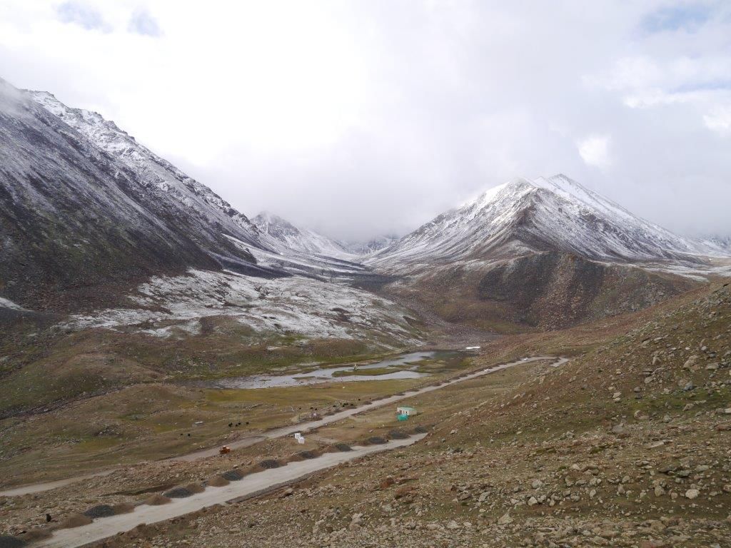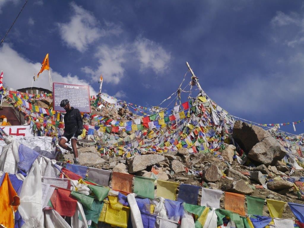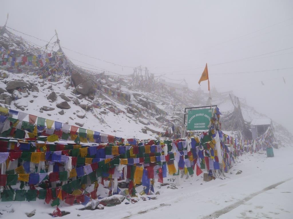 จนประมาณแปดโมงครึ่ง พวกเราได้มาถึงจุดสูงของเส้นทาง Khardungla Pass ซึ่งเป็นเส้นทางรถยนต์ที่สูงที่สุดในโลก สูงประมาณ 5,602 เมตรเหนือระดับน้ำทะเล เส้นทางเส้นนี้มีความสำคัญทางประวัติศาสตร์ เคยใช้เป็นเส้นทางกองคาราวานจากเลห์ไปยังคัชการ์ (Kashgar) ตอนกลางของทวีปเอเชีย อากาศหนาวมาก หิมะตกขาวโพลนไปทุกหนแห่ง เจดีย์เล็กๆตั้งข้างถนนปกคลุมด้วยธงมนตร์จนเกือนมิด สีเขียวเหลืองแดงของธงมนตร์ตัดสีขาวของหิมะสร้างความสวยงามในแบบฉบับที่ไม่ซ้ำใคร