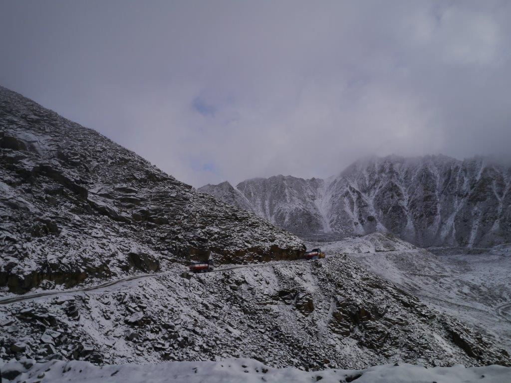 สองข้างทางจากเลห์สู่จุดสูงสุดของKradungla Pass เต็มไปด้วยหมอกหนา ถนนช่วงแรกๆเป็นทางตรง ไม่นานก็เปลี่ยนเป็นทางขึ้นเขาตลอด บางช่วงเหมือนแค่นำหินมาถมๆ ไม่ใช่เส้นทางลาดยาง เส้นทางขรุขระทำเอาพวกเรากระเด้งกระดอนเบียดกันไปมาบนรถ รถเราเริ่มโยกซ้ายป่ายขวาจนนุ่มนิ่มที่นั่งกลางต้องเริ่มขุดเอายาดมขึ้นมา นอกจากโซนัม(ซึ่งเราฝากชีวิตไว้เต็มที่)จะต้องระวังรถสวน ยังต้องคอยขับหลบหินก้อนใหญ่ที่อยู่ๆโผล่ขึ้นมาขวางทาง ในขณะที่อีกฝั่งเป็นริมผาติดเหวลึก หนำซ้ำบางช่วงหิมะเริ่มละลายเป็นน้ำเจิ่งนองให้คอยหลบอีกต่างหาก โชคดีที่คณะเราออกมาเช้ามากจึงไม่ค่อยเจอรถผ่านไปมา ส่วนใหญ่ที่พบเป็นรถบรรทุกที่เพิ่งเริ่มจะออกปฏิบัติการซึ่งมองพวกเราพลางคิดในใจว่า พวกเอ็งจะออกมาเที่ยวอะไรกันเช้าเสียขนาดนี้ รถบรรทุกที่นี่ค่อนข้างใจดี บางครั้งหลบให้รถเล็กไปก่อนถ้าเขาเห็น คนที่นี่ขับรถกันอย่างมีน้ำใจและมีถ้อยทีถ้อยอาศัยกัน
