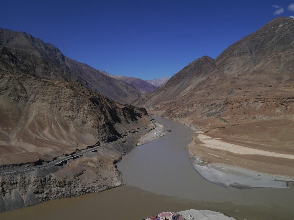 ไม่นานพวกเรามาถึงจุดสำคัญสำหรับถ่ายภาพอีกแล้ว ระหว่างทางจากเลห์ถึงคาร์กิล เมืองสำคัญเมืองหนึ่ง ระหว่างทางไปศรีนาคา เป็นจุดที่แม่น้ำสองเส้นสำคัญของอินเดียมาบรรจบกัน คือแม่น้ำสินธุ (Indus) และ แม่น้ำซันสการ์ (Zanskar) ซึ่งแม่น้ำทั้งสองมีสีที่ต่างกันจึงบังเกิดเป็นแม่น้ำสองสีไหลไปคู่กันเป็นปรากฎการณ์ทางธรรมชาติที่แปลกไปอีกอย่างหนึ่ง