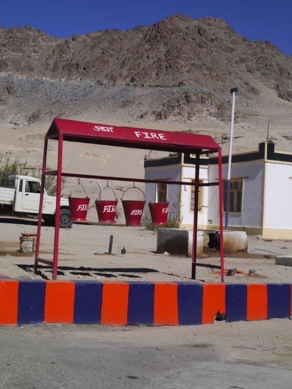วันนี้พวกเราจะไปเที่ยวเมืองอูเล(Ule) ซึ่งอยู่ห่างจากเลห์เป็นระยะทาง 70 กิโลเมตร และ เมืองลามายูรู (Lamayura)ซึ่งอยู่ห่างจากเลห์เป็นระยะทาง 125 กิโลเมตร แม้จะอยู่ค่อนข้างไกล แต่เส้นทางเป็นทางราบอาศัยเส้นทางจากเลห์ไปสู่เมืองศรีนาคา ออกจากตัวเมืองมาได้ระยะหนึ่ง โซนัม ขอแวะเติมน้ำมันรถ (อือ ขับมาได้ตั้งหลายวันไม่เคยเติมเลยนะ) สิ่งที่ประทับใจฉันมาก คือ เครื่องดับเพลิงในปั๊มน้ำมันซึ่งก็คือถังทรายนั่นเอง ถังสีแดงแขวนให้เห็นเด่นชัดว่า FIRE