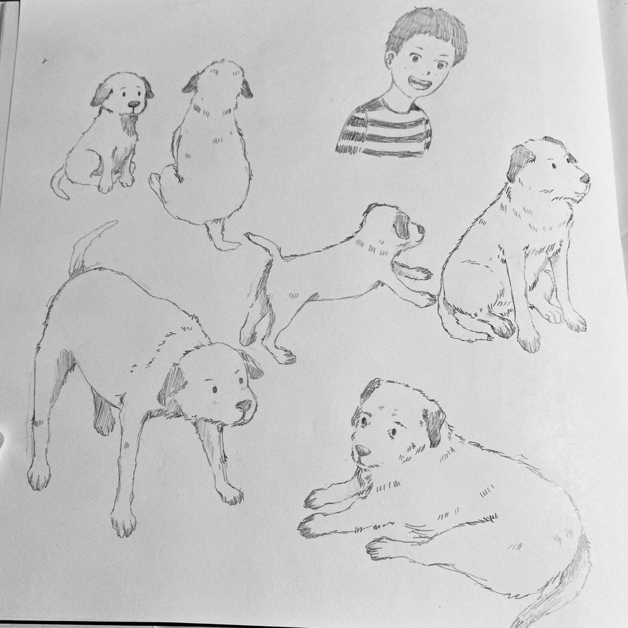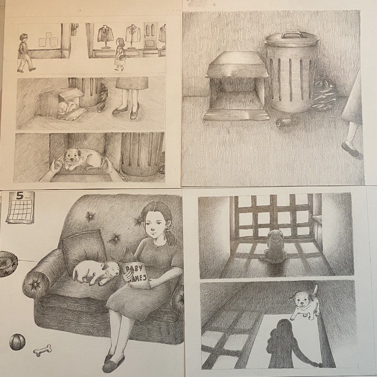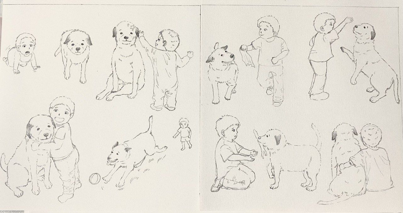 อย่างที่บอกว่าเรากังวลกับการวาดภาพมาก ๆ สุด ๆ ที่สุดในโลก ทำให้เราไม่กล้าลงมือวาดสักที เริ่มแรกเราต้องออกแบบตัวละครส่งให้ครูนุชดู ปัญหามันไม่ได้อยู่ที่ตัวละครที่เป็นคนแต่มันอยู่ตัวละครน้องหมา ตอนเสนอไอเดียเราก็ลืมคิดไปว่า เราไม่เคยวาดหมาแบบดรออิ้งมาก่อน นั่นแหละค่ะทุกปัญหามีทางเข้าไม่พอ ทุกทางออกก็ยังจะมีปัญหา55555555 ในเมื่อมันมาถึงขั้นนี้แล้วไอ้ที่ไม่เคยวาดมันก็ต้องวาดให้ได้แล้ว กลับตัวก็ไม่ได้ให้เดินต่อไปก็ไปไม่ถึงสุด ๆ