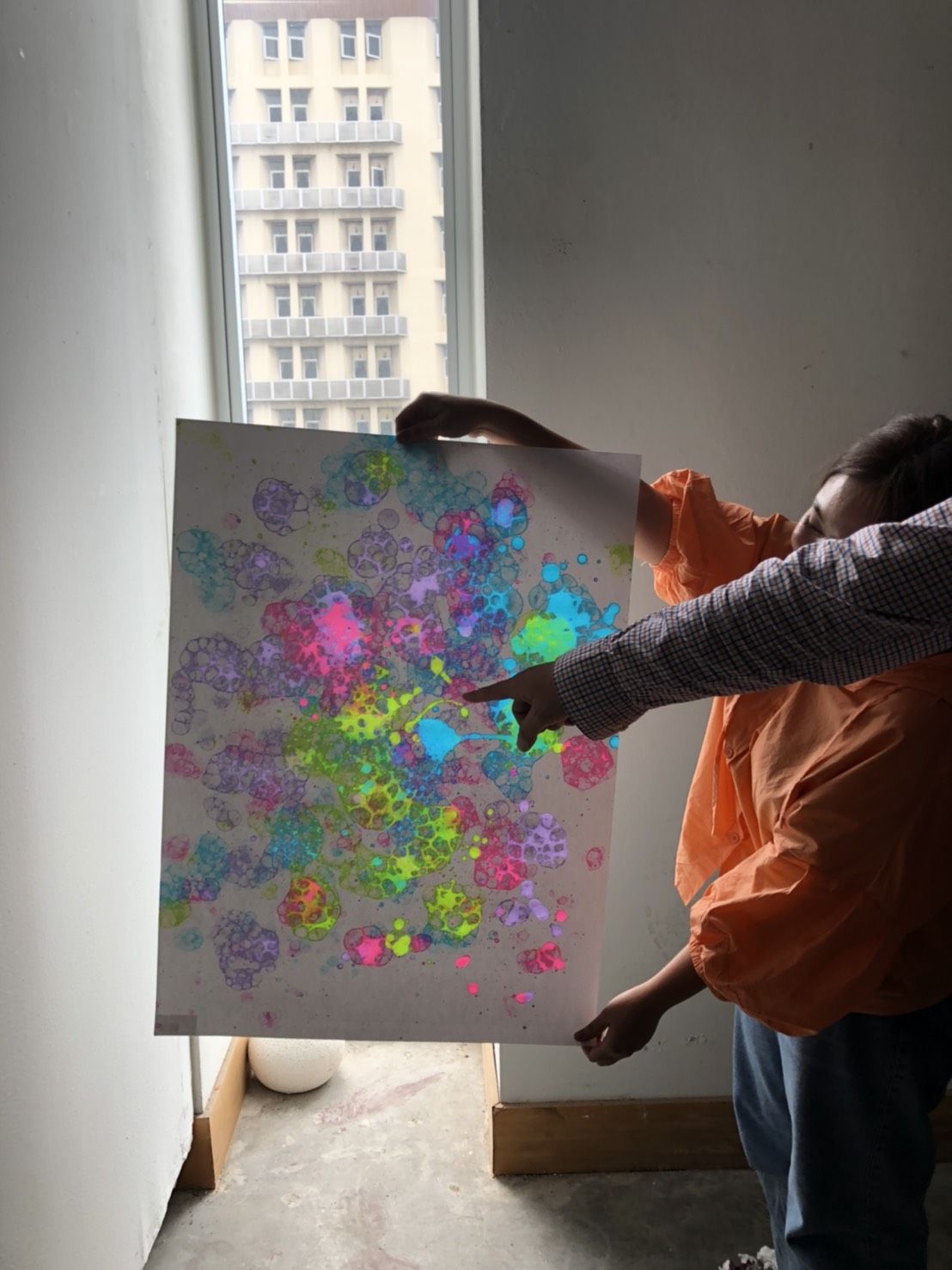 แล้วเราก็คิดได้ว่า ถ้าเรานำฟองสบู่มาทำเป็นงานศิลปะ เป็นการสอนสร้างงานศิลปะง่าย ๆ จากฟองสบู่ หรือ bubble painting ล่ะจะเป็นยังไง เราจึงปรึกษาพี่ผึ้งแล้วสุดท้ายความคิดนี้ก็ถูกเคาะ