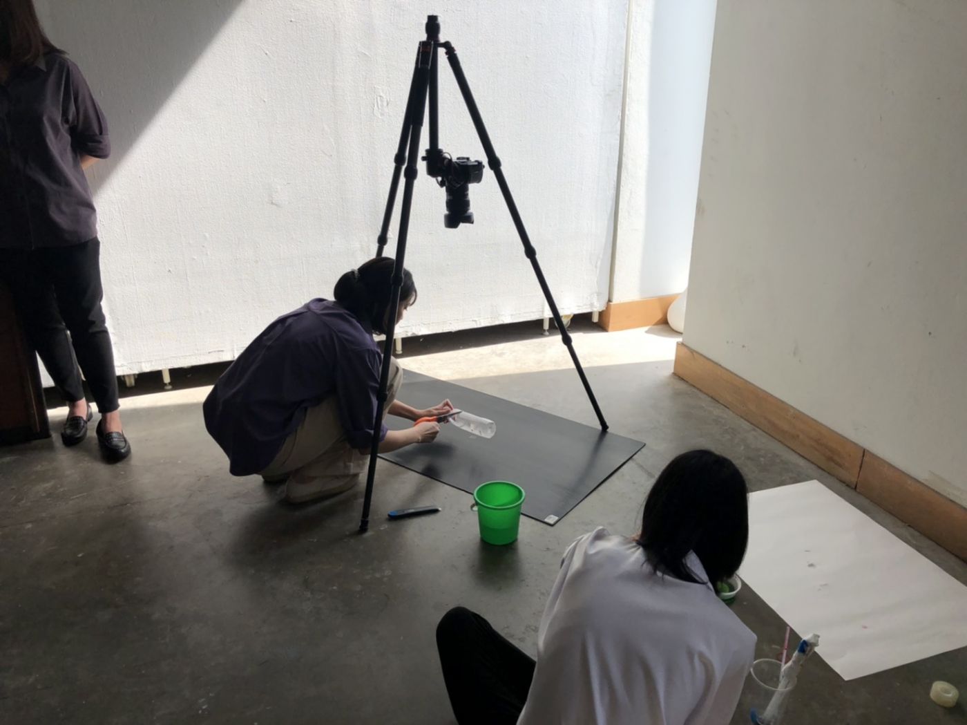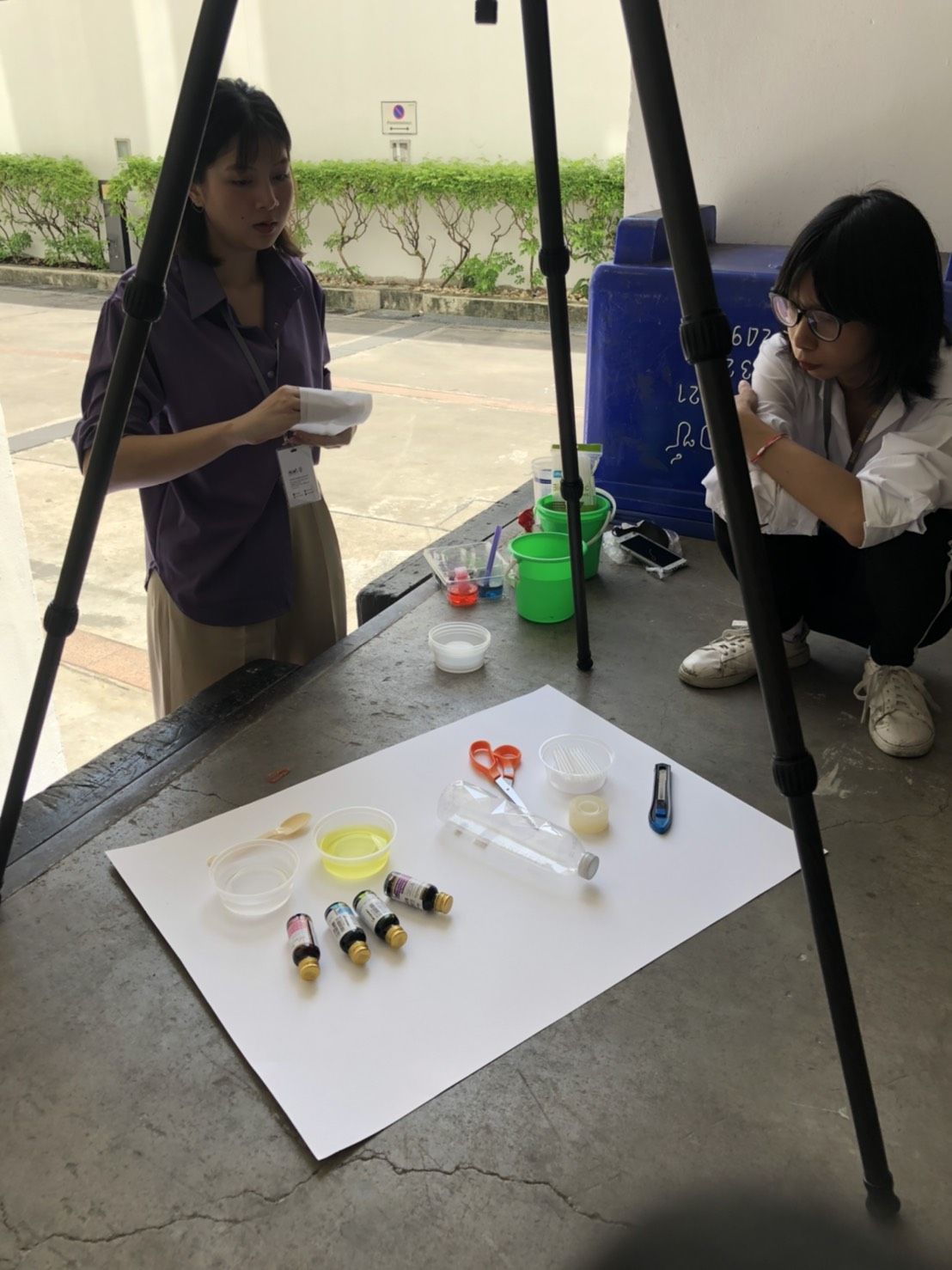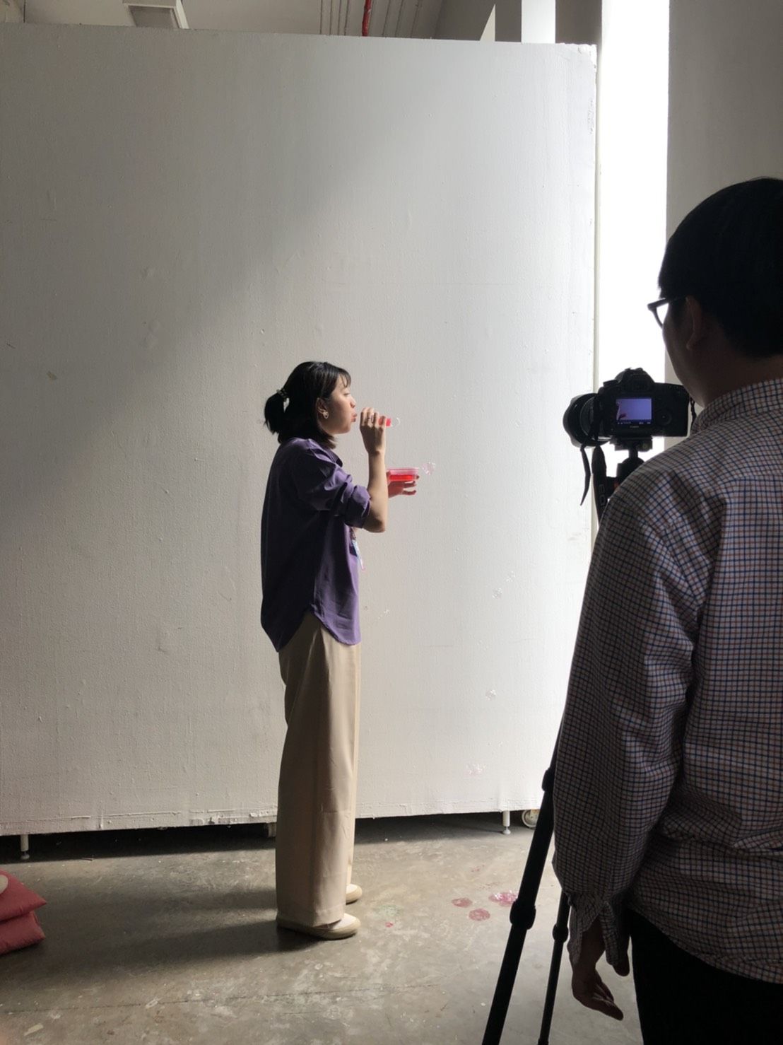 มาถึงวันถ่ายคลิป bubble painting เราเลือกทาง loading ซึ่งอยู่นอกอาคารเป็นสถานที่ในการถ่ายทำ เพราะเกรงว่าถ้าไปถ่ายในห้องประชุมเหมือนเดิมอาจทำให้พรหมในห้องเลอะได้ แต่ด้วยสภาพอากาศที่ร้อนมาก ๆ ทำให้การถ่ายทำเป็นไปอย่างยากลำบาก พี่รันและพี่ ๆ ฝ่าย PR เลยพาพวกเราย้ายไปยังโกดังเก็บของชั้น 2 เป็นห้องที่แสงธรรมชาติสวยมาก ที่สำคัญคือมีแอร์ให้ด้วย ไม่ต้องทนร้อนอีกต่อไป