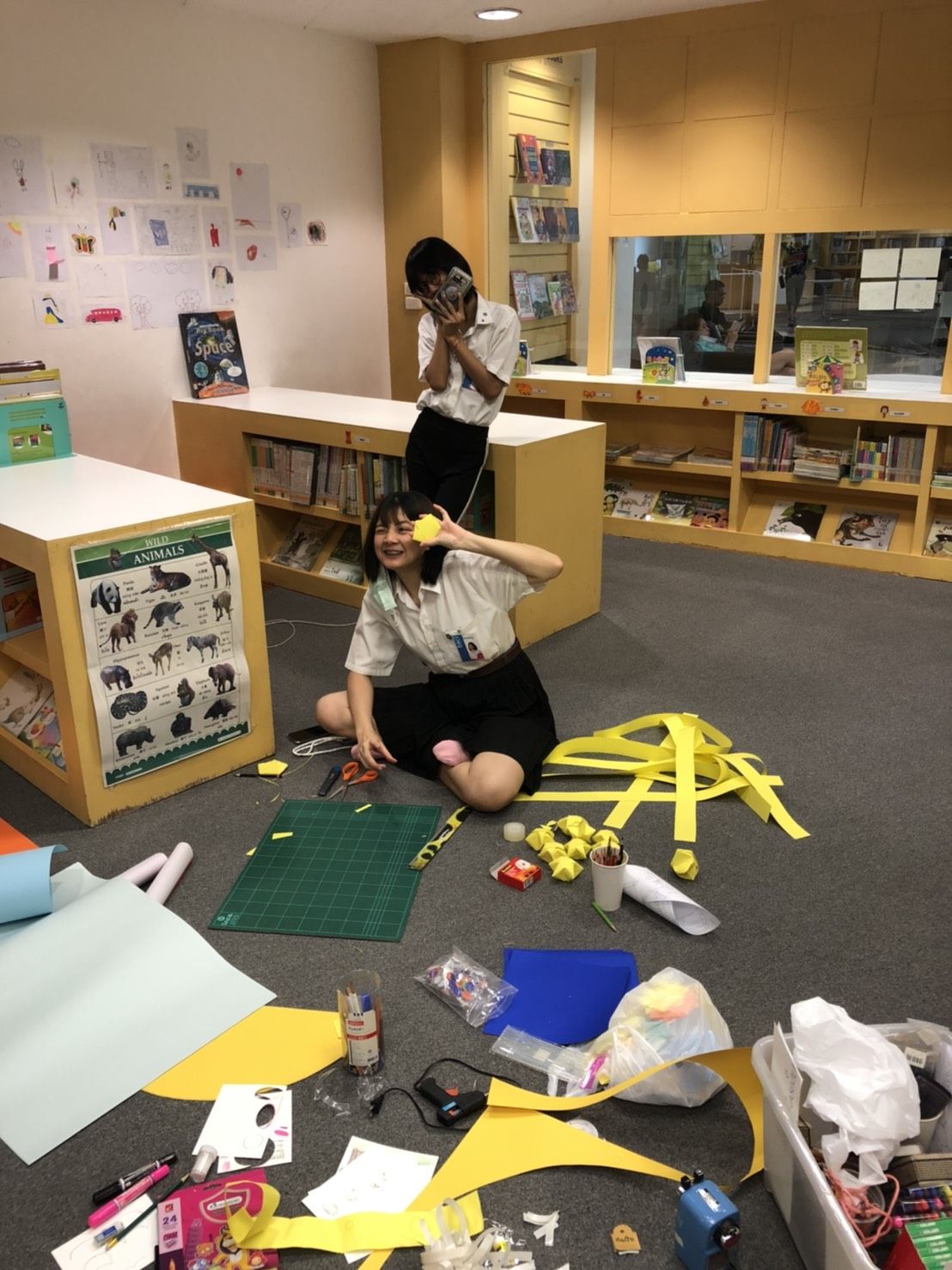 เราเดินจากหอศิลป์ไปสยามเพื่อหาซื้ออุปกรณ์ตกแต่ง ซึ่งธีมหลักที่พวกเราวางไว้ก็คือพระจันทร์ ดาว อวกาศ สีที่เราจะใช้จึงเป็นสีน่ารัก ๆ อย่างสีน้ำเงินกับสีเหลือง นอกจากนี้ก็พยายามใช้อุปกรณ์ที่มีอยู่ในห้องสมุดเพื่อเป็นการประหยัดงบ