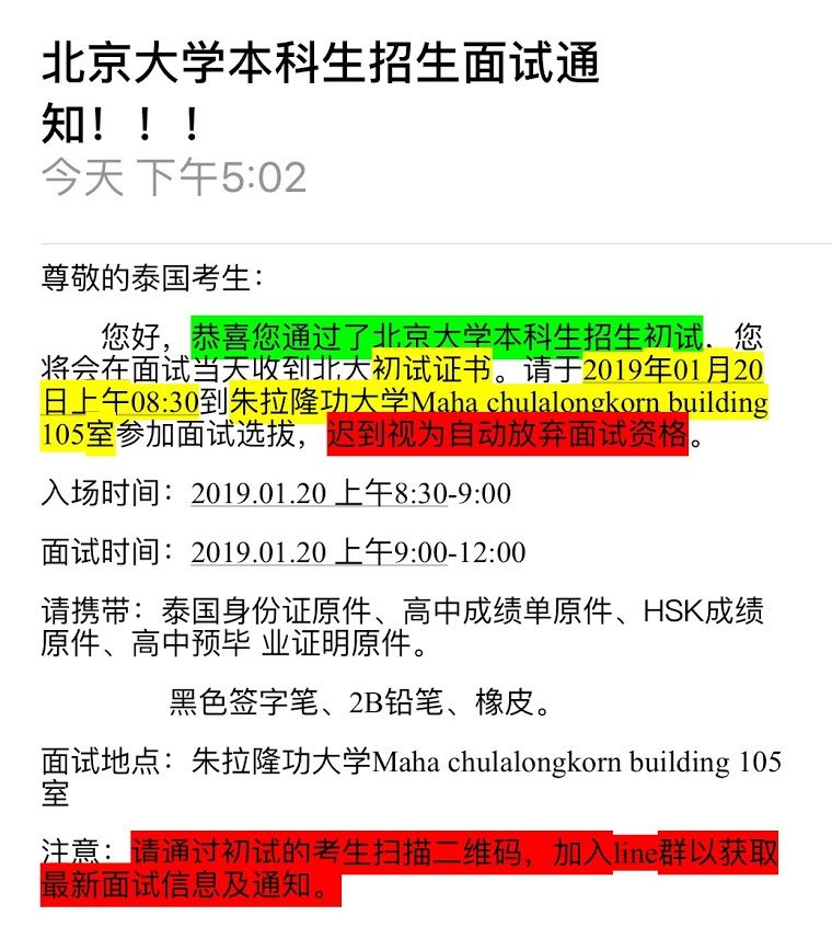 ผลการสอบสัมภาษณ์ครั้งที่๑ออกวันที่ ๗ มกราคมผ่านทางอีเมล์ โดยในเมล์จะแนบกำหนดการสอบสัมภาษณ์รอบ๒มาด้วย ซึ่งนัดวันที่ ๒๐ มกราคม สิ่งที่ต้องพกไปก็มี บัตรประจำตัวประชาชน, เกรด๕เทอม, คะแนนHSK5ใบจริงและใบรับรองการจบค่ะ (ในกรณีที่โรงเรียนไม่มีใบนี้ให้ใช้ใบรับรองสถานะการเป็นนักเรียนแทนไปก่อนได้ค่ะ) และให้พกปากกา, ดินสอ๒บี, ยางลบไปด้วย แต่วันจริงไม่ได้ใช้อะไรนอกจากปากกา๑แท่งเลยค่ะ ให้เอาไปทำไมก็ไม่รู้งง