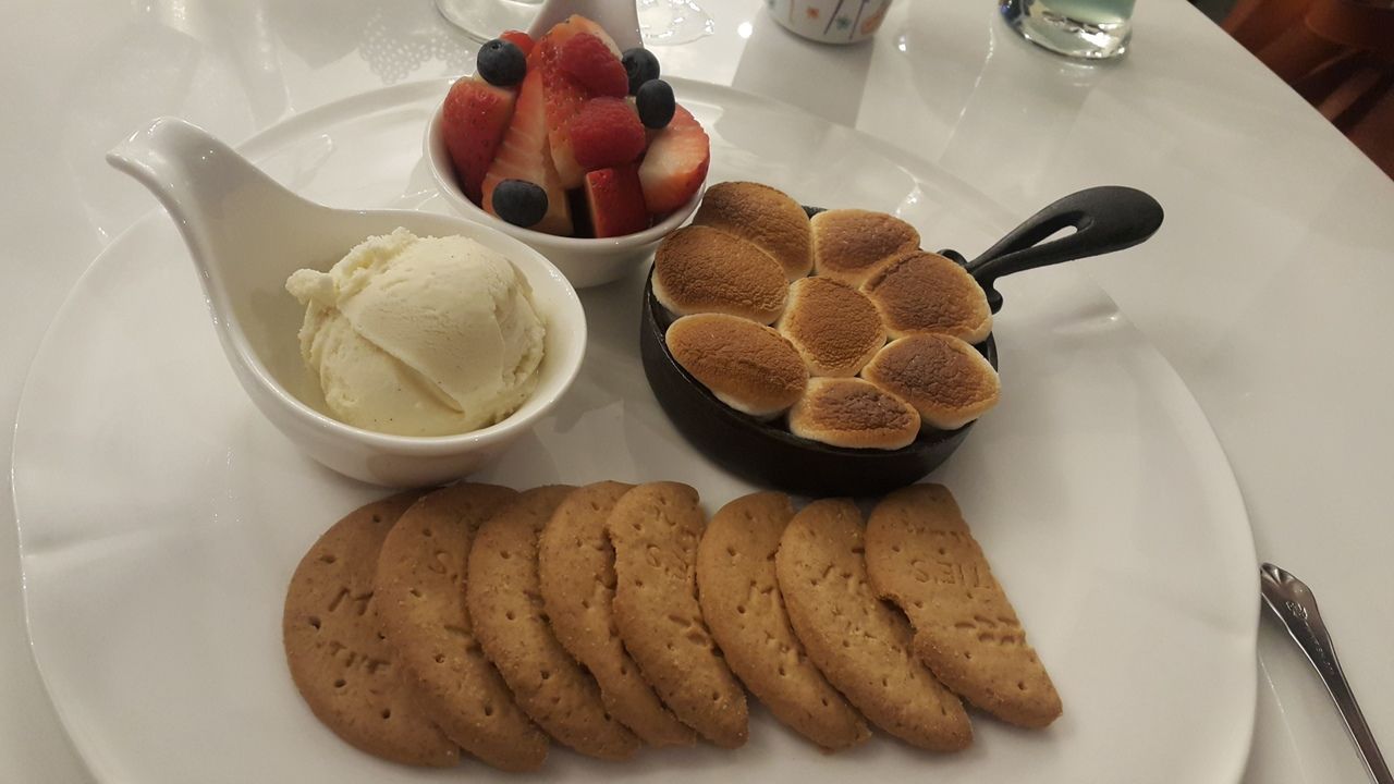 จานสุดท้ายของมื้อนี้ มาชเมลโล่กรอบนุ่มได้ที่ ด้านล่างมีดาร์คชอคโกแลตร้อนๆ เสิร์ฟพร้อมคุกกี้ ไอศครีมและผลไม้สด เป็นของหวานที่เราคิดว่า ไม่หนักท้องจนเกินไป จบมื้ออาหารได้แบบพอดีๆ