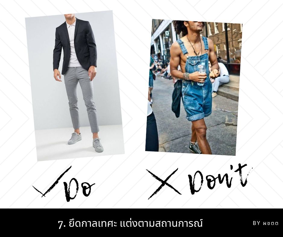 7. กาลเทศะอันนี้สำคัญมากๆสำหรับการเข้าสังคม โดยเฉพาะเมืองไทยเรา การที่ท่านแต่งตัวออกไปไหนมาไหนนั้นควรดูที่กาลเทศะเป็นอันดับต้นๆใช่ว่าไปงานแต่งของเพื่อน ท่าจะใส่สูทสีขาวแย่งซีนเจ้าบ่าว แบบนี้อาจจะหล่อดูดีแต่ท่านอาจจะเคืองๆกับเพื่อนทีหลังได้นะครับ