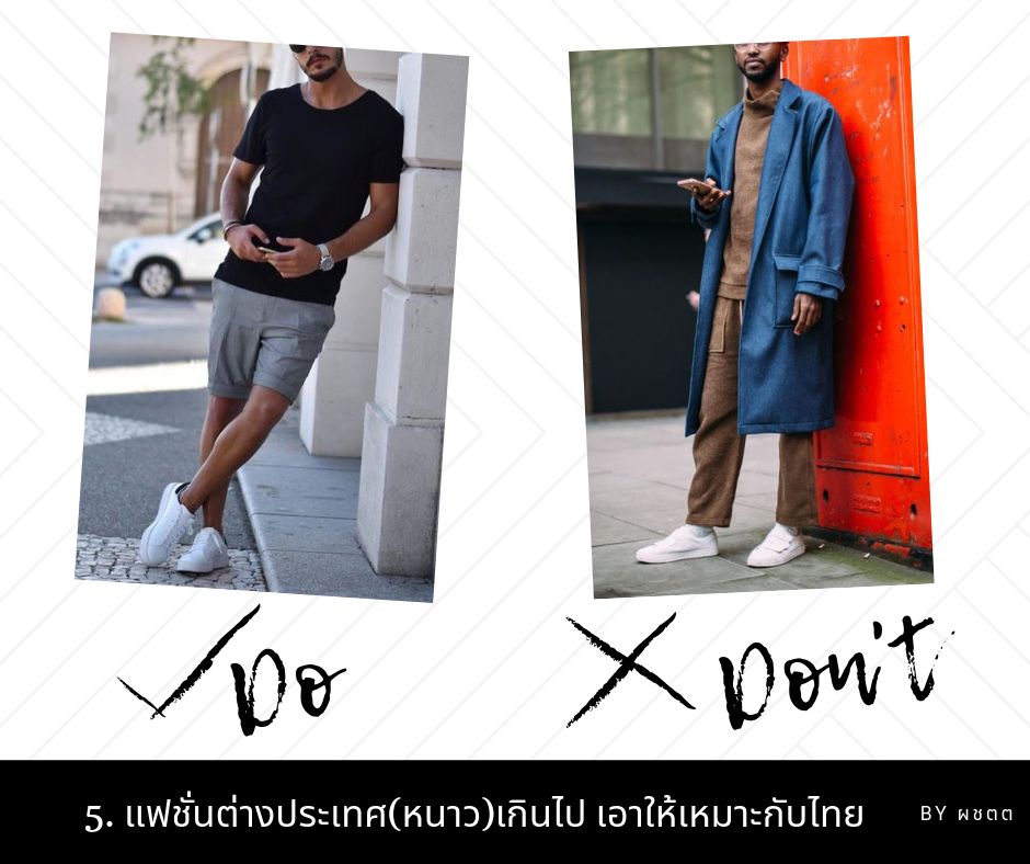 5. แฟชั่นต่างประเทศกรณีนี้เป็นเรื่องที่ดีนะครับที่เราจะหยิบยกแฟชั่นต่างประเทศมาบ้างแต่ในบางครั้งต้องดูดีๆว่าเหมาะสมกับคนไทยหรือไม่ เช่น แฟนชั่นเสื้อหนาๆ หนาวๆหรือแฟชั่นเกาหลีจ๋า ที่อาจจะยังไม่เหมาะกับรูปร่างของท่านเอง