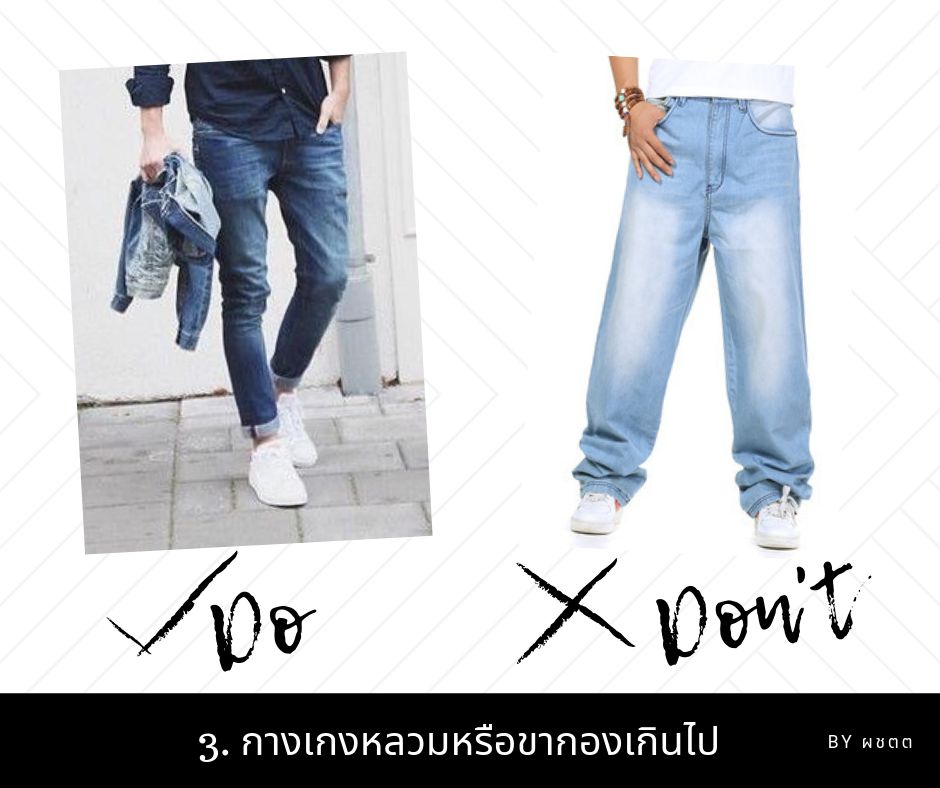 3. กางเกงไม่พอดีกรณีนี้มี 2 แบบครับ 1.คือความเข้ารูปไม่พอดี 2.คือขากางเกงยาวจนเกินไปซึ่งมันอาจจะไม่ได้ทำให้ท่านดูดีทั้ง 2 แบบนะครับ ยังไงก่อนเลือกซื้อคุณสามารถลองก่อนก็ได้ ให้มันพอดีกับรูปร่าง บางครั้งถ้าเราใส่กางเกงที่หลวมเกินไปมันอาจจะทำให้เราดูตัวเล็กลงหรือเตี้ยลงได้