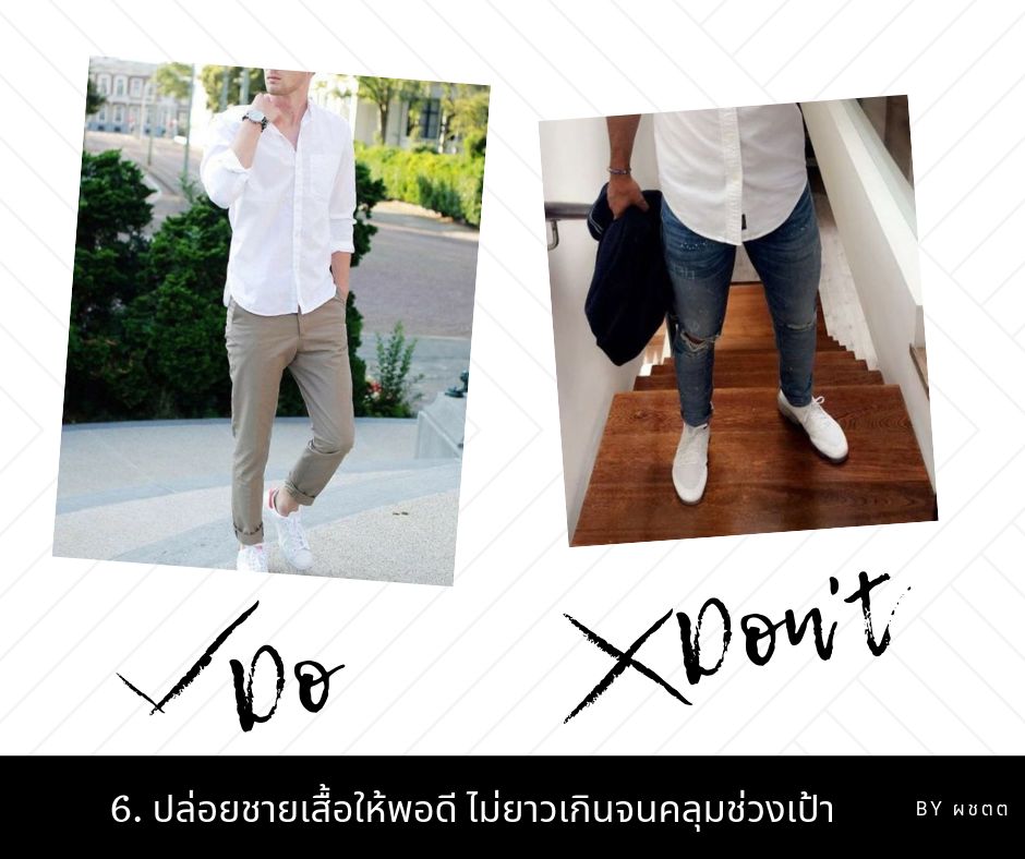 6. ปล่อยชายเสื้ออันนี้ผมอ่านเจอในอินเตอร์เน็ตมาครับ ไม่ได้ร้ายแรงมาก แต่ลองอ่านกันดูสำหรับหนุ่มๆคนไหนที่ชอบปล่อยชายเสื้อแบบปิดตูดปิดก้น ปิดเป้า อันนี้อาจจะทำให้ท่านดูขาสั้นลงนะครับประมาณว่าลำตัวจะดูยาวขึ้นแต่ขาจะดูสั้นลง ลองเลือกเสื้อที่เลยช่วงเป้าขึ้นมาสัก2-3 นิ้ว จะเหมาะสมครับ กรณีนี้ไม่ร้ายแรงมากครับ แต่ถ้าเลือกปรับได้ลองนำไปใช้ดู