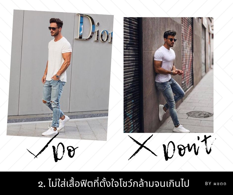 2. เสื้อฟิตที่ตั้งใจโชว์กล้ามจนเกินไปผมเข้าใจว่าเป็นรสนิยมส่วนบุคคลแต่ความอินของบุคคลนั้นๆ แต่ในมุมมองของสาวๆ หรือคนส่วนมากบางครั้งการใส่เสื้อรัดกล้ามจนเกินไปนั้นอาจจะไม่ได้ทำให้คุณดูดีมากนักนอกเหนือเสียแต่ว่าคุณจะดูสูงโปร่งเหมือนกับหุ่นของฝรั่ง แนะนำว่าคุณลองปรับลงนิดๆอาจจะพับแขนขึ้นมา 2-3 ทบ เพื่อโชว์นิดๆหน่อยๆพอยั่วน้ำลายสาวๆ พอดีๆไม่มากไม่น้อยจนเกินไป ก็เป็นอีกหนึ่งทางเลือกที่ดีครับ