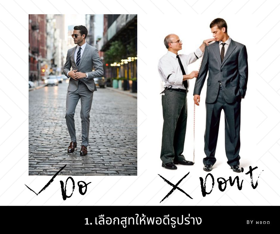 1. เลือกสูทที่พอดีตัวต้องขอบอกก่อนเลยว่าสำหรับผู้ชายคนไหนที่ชอบใส่สูทหรือจำเป็นต้องใส่สูทในที่ทำงานอย่างไรก็แล้วแต่ควรเลือกสูทให้พอดีกับรูปร่าง ไม่รัดติ้วเกินไปและที่สำคัญอย่าหลวมเกินไป นอกจากมันจะไม่ได้ทำให้คุณดูดีขึ้นแล้วสูทหลวมๆโคร่งๆยังทำให้คุณดูแก่ลงอีกด้วย แนะนำให้เลือกที่พอดีกับตัวเองและถ้าหากเป็นไปได้ หากมีกำลังก็สั่งตัดไปสะเลยครับอย่างน้อยๆสูทดำหรือกรมท่านั้นก็สามารถใส่ได้หลายๆงานไปแบบยาวๆถือว่าคุ้มค่ากับการตัดมาด้วยนะครับ