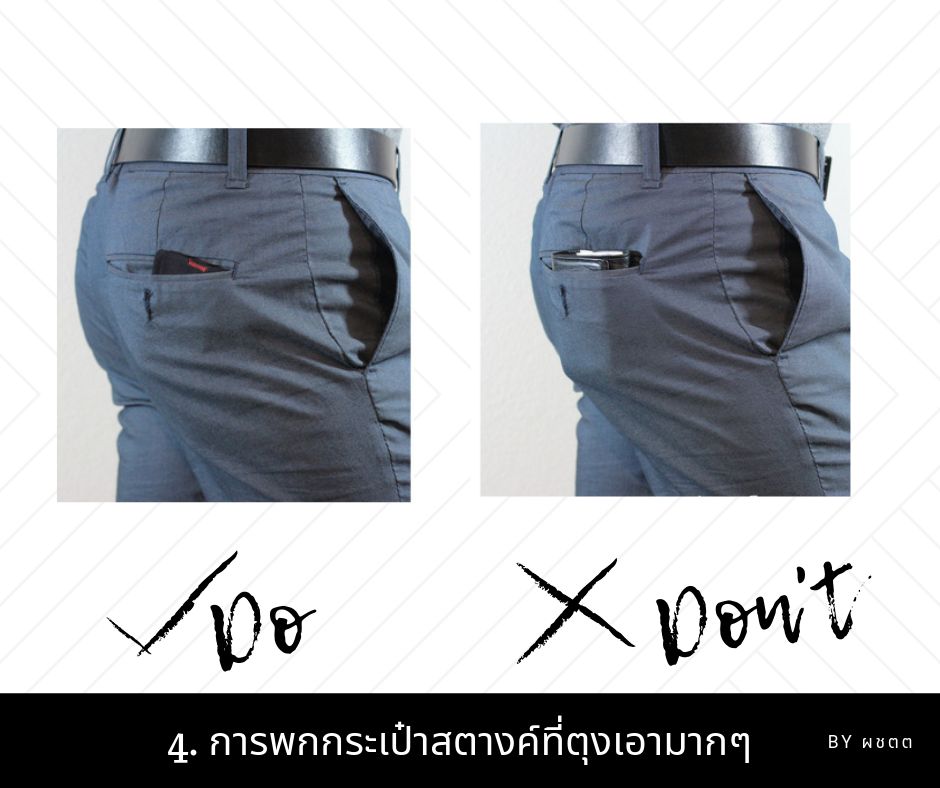 4. การพกกระเป๋าสตางค์ที่ตุงเอามากๆอันนี้คุณสุภาพบุรุษหลายๆท่านไม่ทันคิดครับ ซึ่งผมว่ามันไม่ได้แย่เท่าไหร่ถ้าหากกระเป๋าสตางค์ตุงๆของท่านนั้นมันไปอยู่ด้านหลังซึ่งอาจะไม่มีใครเห็น แต่ถ้าหากมันมาอยู่ด้านหน้าของท่านทั้งกระเป๋าซ้ายและขวาจะทำให้รูปทรงก็ท่านดูผิดแปลก ดูขัดหูขัดตา บางท่านไม่ใช่กระเป๋าสตางค์แต่กลับเป็นผ้าเช็ดหน้า โทรศัพท์ ปากกาต่างๆนานา ประดังประเดอยู่ในกระเป๋าเต็มไปหมดแนะนำว่าลองหากระเป๋าดีๆสักใบ แล้วนำของพวกนี้ใส่ลงไปนะครับ จะทำให้บุคคลิกคุณดูดีขึ้นเยอะเลยทีเดียว