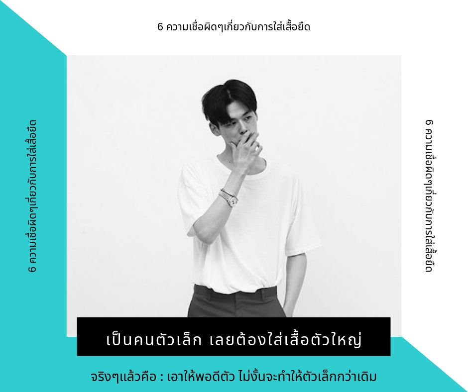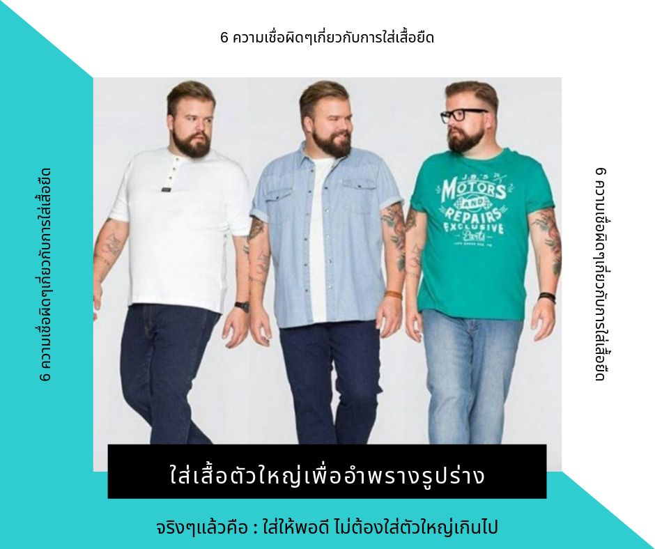 1. ใส่เสื้อตัวใหญ่เพื่ออำพรางรูปร่าง อันนี้ผิดถนัดเลยครับซึ่งบอกได้เลยว่าเป็นกันทั้งผู้ชายและผู้หญิงสำหรับผู้ชายท่ายไหนที่ชอบใส่เสื้อยืดตัวใหญ่ๆหรือยาวลงมาปิดพุงความคิดเดิมๆคือการช่วยอำพรางรูปร่าง แต่จริงๆแล้วมันไม่ได้ช่วยเท่าไหร่ครับการเลือกเสื้อยืด อันดับแรกเลยความเลือกตัวที่พอดี ถ้าหากคุณเลือกตัวใหญ่ๆมาปิดพุง หรือเอวมันจะทำให้ท่านดูเตี้ยลง และดูตัวใหญ่มากขึ้นอีกด้วยและสิ่งที่ผมจะฝากไว้อีกข้อหนึ่งนะครับ คือคุณต้องมั่นใจๆหน่อย เพราะความมั่นใจทำให้คนเราดูดีขึ้น