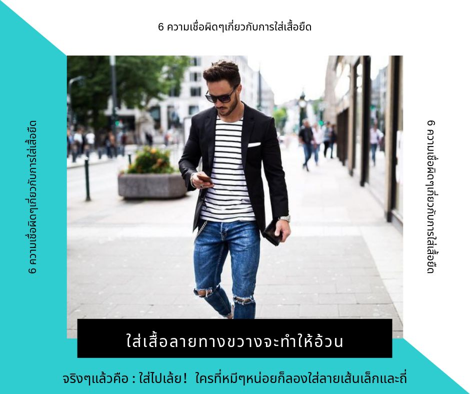 6. ใส่เสื้อลายทางขวางจะทำให้อ้วน อันนี้ก็เป็นข้อเข้าใจผิดที่มีมานานเช่นกันครับ ทั้งคุณผู้ชายและคุณผู้หญิง ว่าการใส่เสื้อลายทางแนวนอนจะทำให้อ้วนซึ่งผมขออธิบายอย่างนี้นะครับ การที่เราเลือกใส่ลายทางขวางนั้นสามารถช่วยดึงดูดสายตาได้ทำให้เราดูโดดเด่นขึ้นนอกจากนี้ลายขวาที่เป็นเส้นๆนั้นจะช่วยหลอกตาหุบขยายสัดส่วนได้อีกด้วย เช่นตรงไหนที่คุณมีสัดส่วนที่ใหญ่ลายขวางก็จะช่วยเสริมส่วนนั้น แต่ส่วนไหนที่เล็กลายขวางก็จะช่วยบีบนำลายตาให้เล็กเช่นกันในทางกลับกันหลายๆท่านกลับคิดว่าการใส่ลายตรงจะทำให้ผอมซึ่งผมบอกก่อนเลยว่าไม่ใช่ทุกครั้งไปในทางกลับกันบางครั้งอาจะทำให้คุณดูอ้วนได้หากใส่ผิด เช่น คุณเป็นคนมีพุงและอยากใส่ลายตรง กลับกลายเป็นว่าลายเส้นตรงที่คุณใส่นั้นดันมาเบี้ยวตรงพุงนั่นแหล่ะครับ มันจะชัดเจนทันทีประมาณว่า “โลกเบี้ยว” เส้นลายเสื้อเบี้ยว โดนบีบ บางครั้งทำให้คุณดูแย่ลงด้วยซ้ำดังนั้นการใส่ลายขวางนั้นใส่ได้ครับไม่ว่าจะหุ่นไหน มีข้อแม้นิดหน่อยคือถ้าคุณหุ่นใหญ่ อ้วน หรือมีพุง ลองเลือกลายที่เป็นเล่นเล็กๆลง ถี่มากขึ้นก็จะดูดีครับ