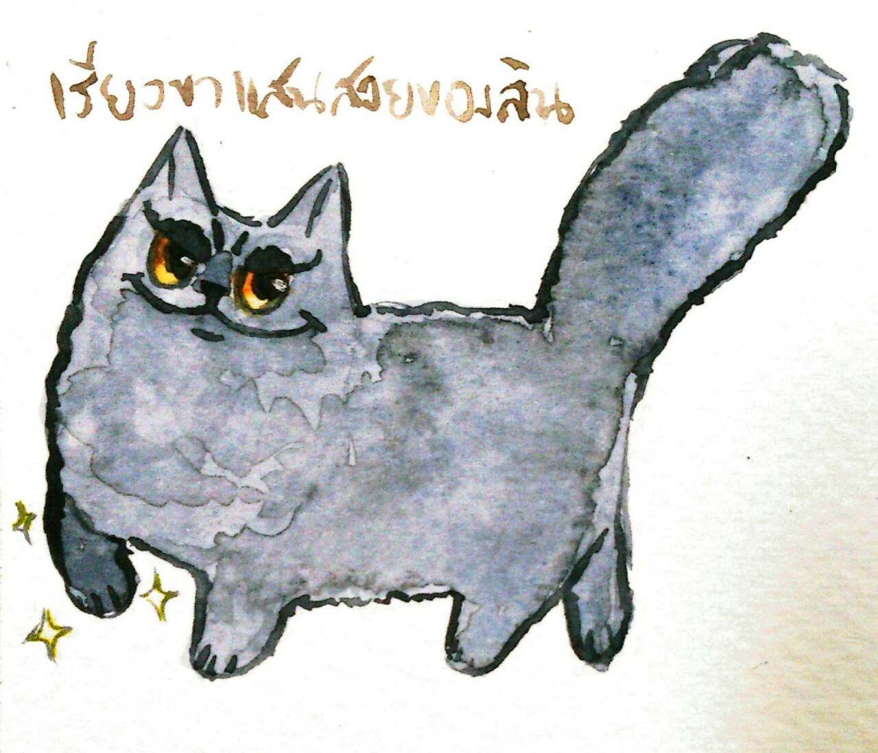 แมวเราเอง นางชื่อไพลิน นางคิดว่านางสวยมาก แล้วนางก็สวยมากจริงๆ แต่นางไม่ได้สวยพิมพ์นิยม หน้าตานางเหมือนจองเวรทุกคนที่จ้องตานาง ขนาดมีน้องคหนนึ่งกล่าวว่า "นี่แมวหรืองูบาซิลลิสก์ จ้องตาแล้วเหมือนจะถูกสาป" แมวบ้านเราทุกตัวมีคาแรคเตอร์เหมาะวาดการ์ตูนมาก นิสัยแปลกๆ การใช้สีน้ำนี่ก็เป็นส่วนหนึ่งของการอยากวาดแมวที่บ้านเป็นการ์ตูนนะ คือถ้าใช้โคปิคคงเปลืองมาก #ร้องไห้แรง