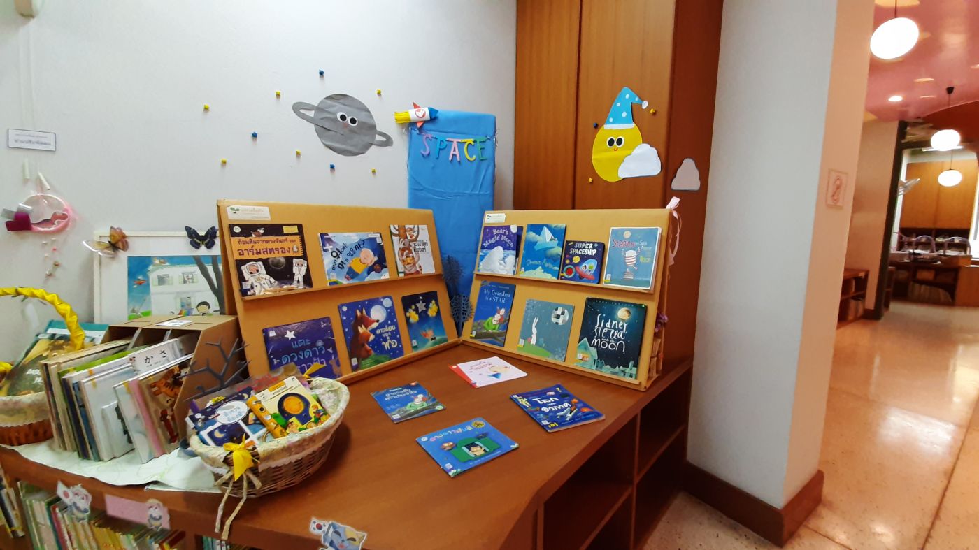 ในมุมเดียวกันกับหนังสือภาษาต่างประเทศ จะมีจุดที่จัดนิทรรศการหนังสือตามตีมที่กำหนดไว้ ตีมแรกที่เรากับเพื่อนช่วยกันทำเป็นตีม Space หรือ อวกาศนั่นเอง พวกเราก็จะจัดหาหนังสือที่เนื้อหาอวกาศหรือใกล้เคียงกับอวกาศที่สุดมาจัด ซึ่งเวลาที่เด็ก ๆ มาดูหนังสือที่มุมนี้ก็มีหลายคนหยิบยืมกลับบ้านไปด้วยเหมือนกัน