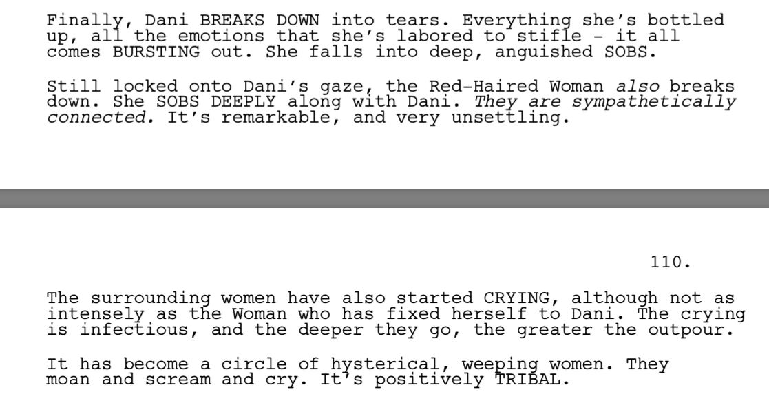 บทอธิบายถึง 'การปลดปล่อย' อารมณ์ทั้งหมดของแดนี่ที่เคยเก็บกักราวยัดใส่ขวดแก้วไว้ อารมณ์ทั้งหมดที่เธอเหนื่อยล้าอดกลั้นไม่ปล่อยออกมา ผู้หญิงทุกคนในวงนั้นเชื่อมโยงกันด้วยความเห็นอกเห็นใจ อาริ แอสเตอร์นิยามฉากว่า "It's remarkable, and very unsettling - มันช่างโดดเด่นเป็นพิเศษ และน่าตื่นตระหนกเอามากๆ"