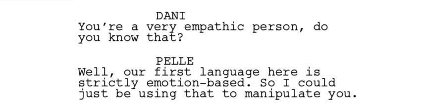 โดยใน Midsommar คริสเตีียน 'ต้อน' แดนี่ในบทสนทนาเปิดเรื่อง เขาพยายามอธิบายและนิยาม 'ความเป็นไป' ของน้องสาวแดนี่