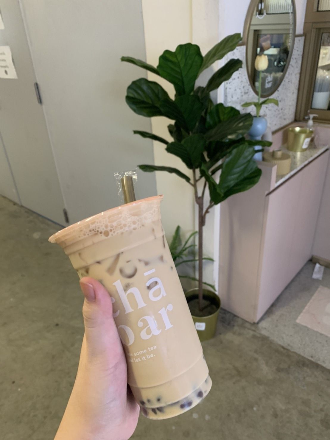 รีวิว : เมนูนี้ที่เราสั่งจะเป็นชานมไข่มุกไรซ์เบอร์รี่น้า ซึ่งทางร้านจะมีให้เลือกระดับความหวานต่างๆ อันนี้ที่เราสั่งมาเป็นหวาน 50% นะคะ รสชาติตัวชาจะมีความหวานปกติออกไปทางจืดนิดๆใครที่ชอบหวานเราว่าสั่งระดับปกติเลยน่าจะลงตัวเลย ♥สัมผัสแรกของรสชาจะไม่ได้ว้าวมากคือเป็นเหมือนชานมทั่วไปแต่จะมีจุด climax คือรสสัมผัสสุดท้ายที่กลืนชาลงไปเราได้กลิ่นความหอมของชา ซึ่งมันทำให้เรากลับรู้สึกชอบขึ้นมา(ค่อนข้างมาก) ส่วนตัวเราชอบนะชอบตรงที่ชานมของ Cha bar มีความหอมของตัวชา ซึ่งตรงความหอมกลิ่นชามันดูมีความเป็นเอกลักษณ์ของทางแบรนด์ ทางร้านมีเมนูที่หลากหลายทั้งนมสด ชานม ชาไทย ชาเขียว ชานมดาร์คช็อกโกแลต ชาผลไม้ กาแฟ และไอศกรีม! ทางร้าน Cha bar เค้ายังมีชานมแบบขวด ที่สามารถนำกลับไปฝากคนที่เรารัก หรือแช่ไว้กินวันอื่นอีกกภายนอกร้านจะเป็นร้านขนาดเล็ก มินิมอล มีมุมให้ถ่ายรูปกับกระจกหรือจะถ่ายกับตัวร้าน Cha bar ก็ชิคๆ ถ่ายภาพออกมาแล้วดีมากๆ recommend เลยค่าา >__<