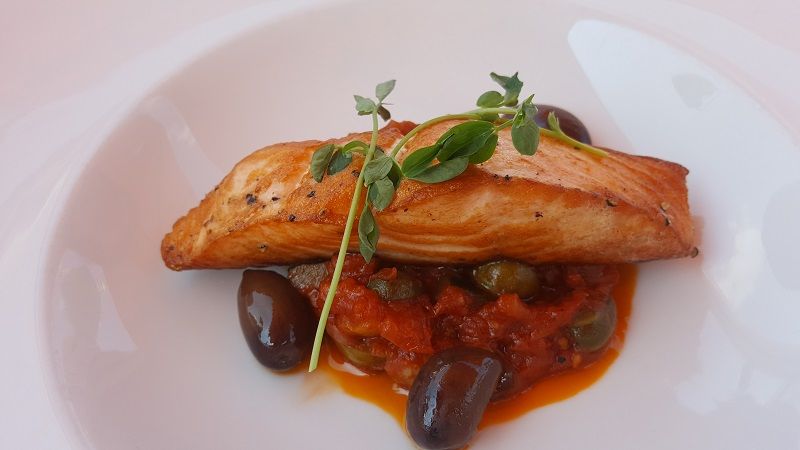 Salmon Fillet, Caponata, Rosemary Oil, Calamata Olives