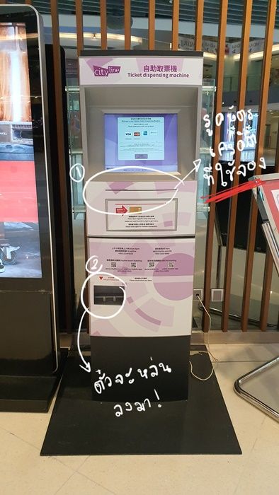 แต่จิ้มๆ ตู้ดูแล้วไม่มีให้ตัวหนังสือหรือช่องกรอกอะไรเลยว่ะ มีให้ใส่แต่ตัวเลข ลองยังไงก็ไม่สำเร็จ ระหว่างนั้นก็มีผู้ชายคนนึงมากดเอาตั๋วจากตู้พอดี ซึ่งวิธีการก็แสนจะง่ายคือรูดบัตรเครดิตแล้วตั๋วก็หล่นลงมาในช่องด้านล่าง