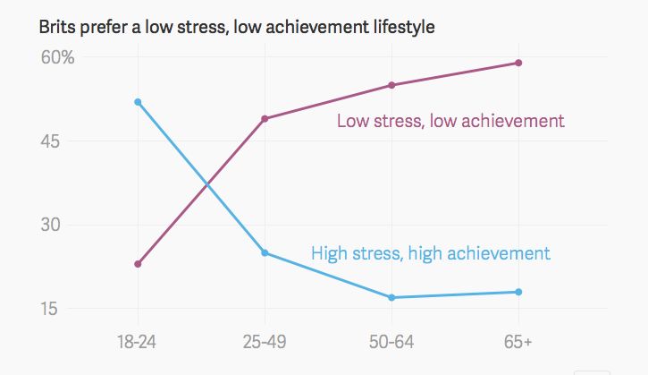 ทีนี้ YouGov เขาก็ไปทำสำรวจมาว่าคนต้องการไลฟ์สไตล์แบบไหนระหว่างไลฟ์สไตล์แบบ เครียดน้อยประสบความสำเร็จน้อย กับ เครียดมากประสบความสำเร็จมาก ก็พบว่าตอนเด็กๆ คนสหราชอาณาจักรอายุ 18-24 คนจะเลือกแบบหลัง (เครียดมากประสบความสำเร็จมาก) แต่พออายุมากกว่านั้นก็ขอเลือกเครียดน้อยๆ ดีกว่า ส่วนคนอเมริกันก็มีแพทเทิร์นแบบเดียวกัน แต่จะมาเปลี่ยนใจตอนอายุ 30