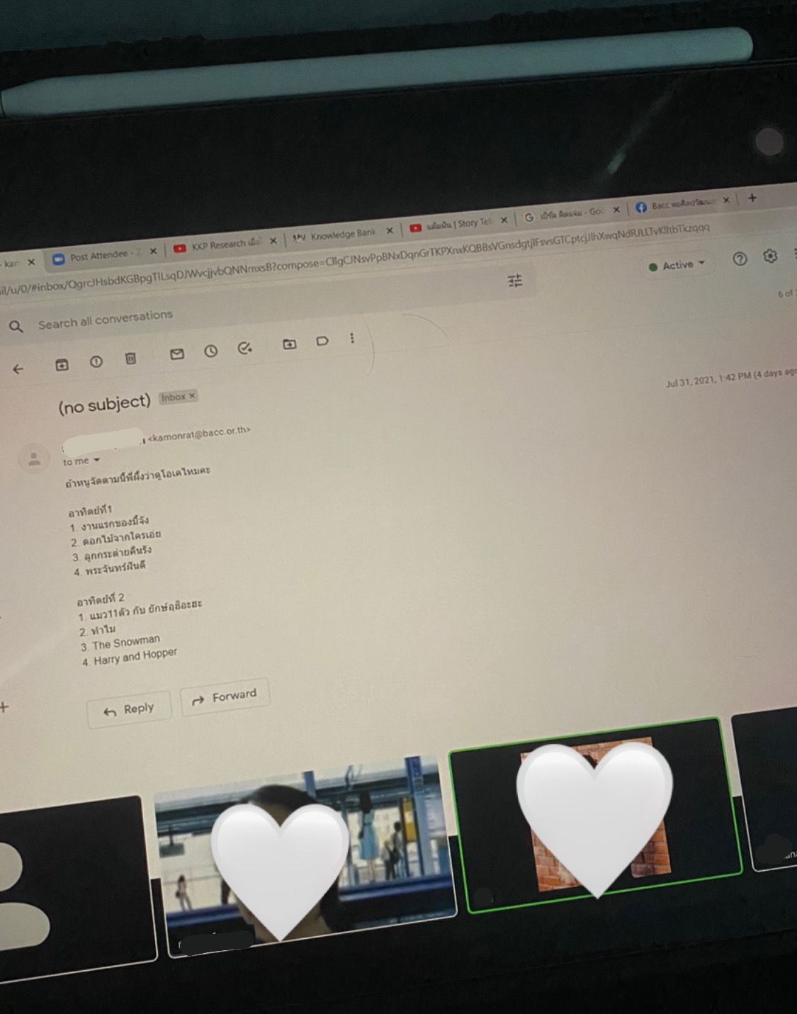 สถานการณ์covid-19 ยังคงไม่ดีขึ้น หอศิลป์ถูกสั่งปิดอีกครั้ง พวกเราที่ตั้งใจจะเข้าห้องสมุดไปทำกิจกรรมกับเด็ก ๆ จึงต้องพับเก็บความตั้งใจนั้นไป เมื่อทำกิจกรรมไม่ได้งานทั้งหมดจึงอยู่ในออนไลน์แต่คลิปเก่าที่เราทำเสร็จแล้วยังไม่ได้รับการเผยแพร่ เพราะยังมีคอนเทนต์อีกจำนวนมากที่รอต่อคิวอยู่ พวกเราจะไปเสนองานกับพี่ผึ้งเพิ่มเติมและเป็นสิ่งที่เราจะสามารถทำได้ในช่วงนี้ และได้เกิดเป็นคอนเทนต์แนะนำหนังสือทั้งหมด10เลย ลงผ่านช่องทาง Facebook ที่เพื่อนของเราเป็นคนเสนอไป อีกทั้งเราได้มีการเสนอเล่านิทานออนไลน์แต่ทางพี่ ๆ หลายฝ่ายบอกว่าอยากให้เข้ามาจัดและใช้อุปกรณ์ที่หอศิลป์มากกว่าแต่ด้วยสถานการณ์นี้เรายังทำไม่ได้ อีกอย่างคือต้องประกาศล่วงหน้าเป็นอาทิตย์ซึ่งมันอาจจะเลยเวลาฝึกงานของเรากิจกรรมนี้เลยต้องพับเก็บไป