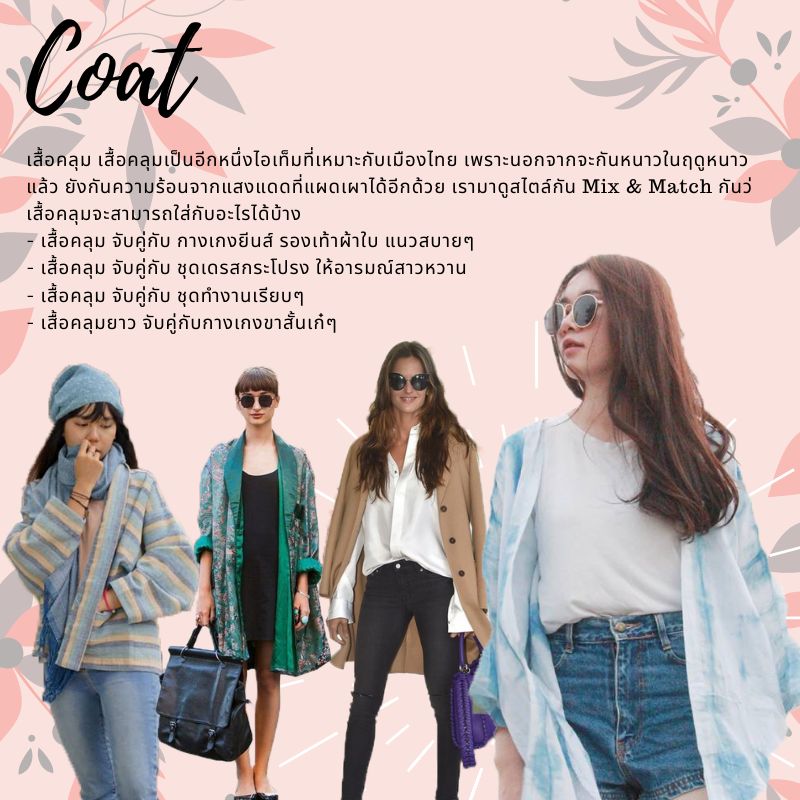 เสื้อคลุมเป็นอีกหนึ่งไอเท็มที่เหมาะกับเมืองไทย เพราะนอกจากจะกันหนาวในฤดูหนาวแล้วยังกันความร้อนจากแสงแดดที่แผดเผาได้อีกด้วย เรามาดูสไตล์กัน Mix& Match กันว่าเสื้อคลุมจะสามารถใส่กับอะไรได้บ้าง