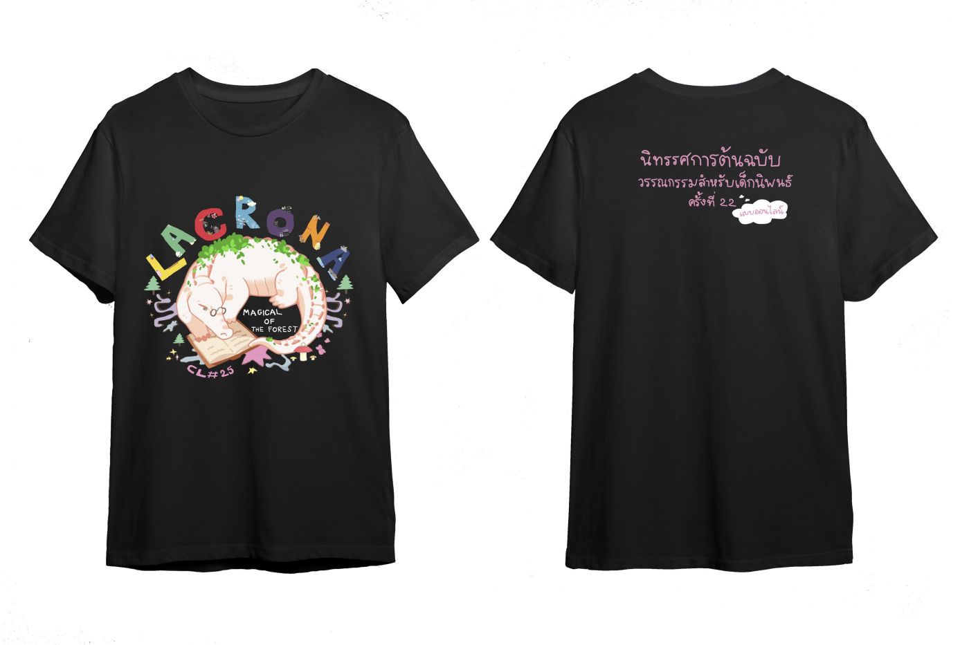 ฝ่ายออกแบบเสื้อทำม็อกอัปแล้วส่งให้เพื่อนทุกคนในสาขาร่วมโหวต ต่อมาเราได้รับการบอกจากอาจารย์ให้เพิ่มข้อความว่า ‘นิทรรศการต้นฉบับวรรณกรรมสำหรับเด็กนิพนธ์ครั้งที่ 22 แบบออนไลน์’