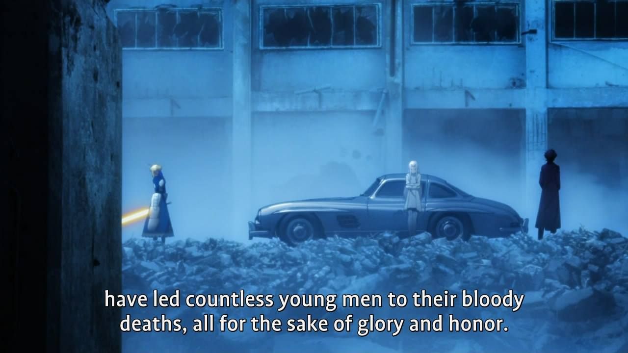 (คิริสึงุ ) "...วีรบุรุษผู้นี้กำลังนึกว่าการอยู่ในสงครามนั้นดีกว่าขุมนรก อย่ามาล้อเล่นดีกว่า สงครามนั่นแหละที่เป็นขุมนรกในตัวเองอยู่แล้ว ..."