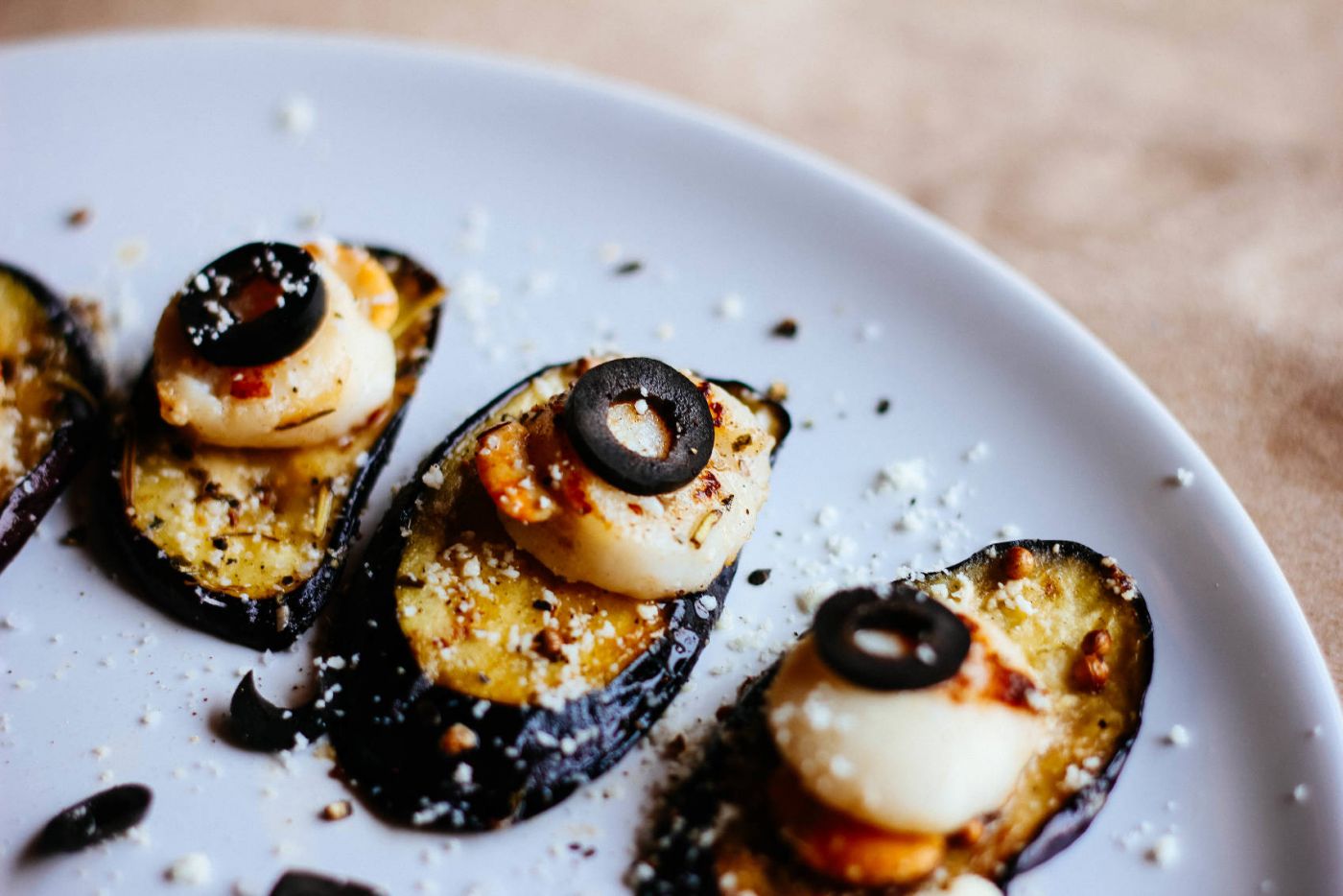 ๒. นำเนยจืดละลายในกระทะ แล้วเอาหอยเชลล์ไปจี่ให้พอสุก อย่าให้น้ำในตัวเนื้อหอยออกมาหมด แล้วนำมะเขือม่วงที่จี่เกรียมจากข้อ ๑. มาแล้ววางหอยเชลล์บนเนื้อมะเขือม่วง วางเรียงให้ดี แล้วตั้งไฟอ่อน ปิดฝาอบประมาณ ๑-๒ นาที