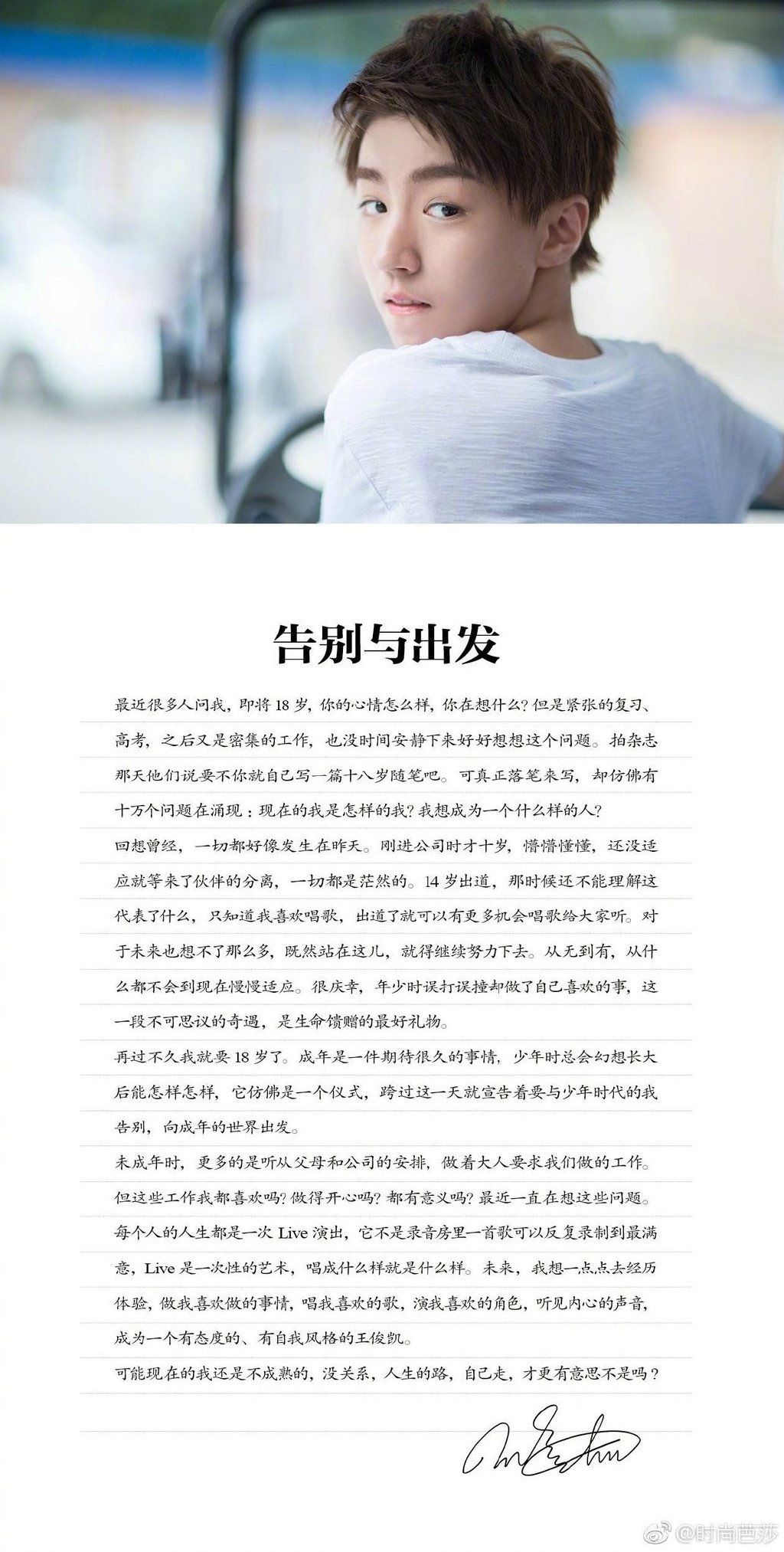 > เสี่ยวข่ายคนฉลาดน่ารัก สดใสของฉัน สุขสันต์วันเกิดนะ ไม่ว่านายอายุเท่าไหร่ก็ขอให้มีความสุขตลอดไปปีหน้าก็ขอให้โชคดีและดียิ่งขึ้นไปอีก ขอให้สนุกสนานเฮฮาไปกับทุกวันบนเส้นทางแห่งชีวิตนี่คือสิ่งที่ฉันคาดหวังกับตัวนายมากที่สุด ยังจำวันแรกที่เจอนายได้ เป็นช่วงก่อนถ่ายทำรายการเกาเหนิง วันนั้นทุกคนต้องมาถ่ายภาพโปรโมท ระหว่างการถ่ายทำรายการทำให้พวกเราได้รู้จักสนิทสนมที่ประทับใจมากที่สุดคือตอนที่พวกเราปั่นจักรยานสองตอนด้วยกัน รู้สึกเหมือนเป็นเจ้าลมกรดเลย แล้วขอแสดงความยินดีด้วยที่สอบเข้าสถาบันภาพยนตร์ปักกิ่งและกลายมาเป็นรุ่นน้องฉันได้สำเร็จ หวังว่านายจะเก่งขึ้นๆ นะ สุขสันต์วันเกิดดูแลสุขภาพด้วยอย่าหักโหม ในฐานะที่เป็นพี่ชายจะไม่พูดมากแล้วกัน เพราะวันเกิดนายทุกปีหลังจากนี้ไม่ว่าจะเป็นคลิปวีดีโอ ข้อความเสียง หรือตัวฉันเอง ก็จะมาอวยพรให้นายทุกปี เป็นสักขีพยานถึงการเติบโตของนายส่วนในฐานะเพื่อนก็ขอให้นายโชคดี